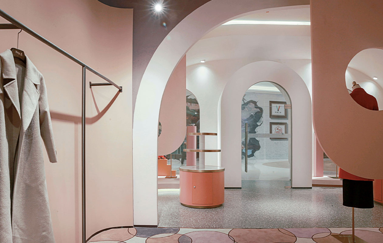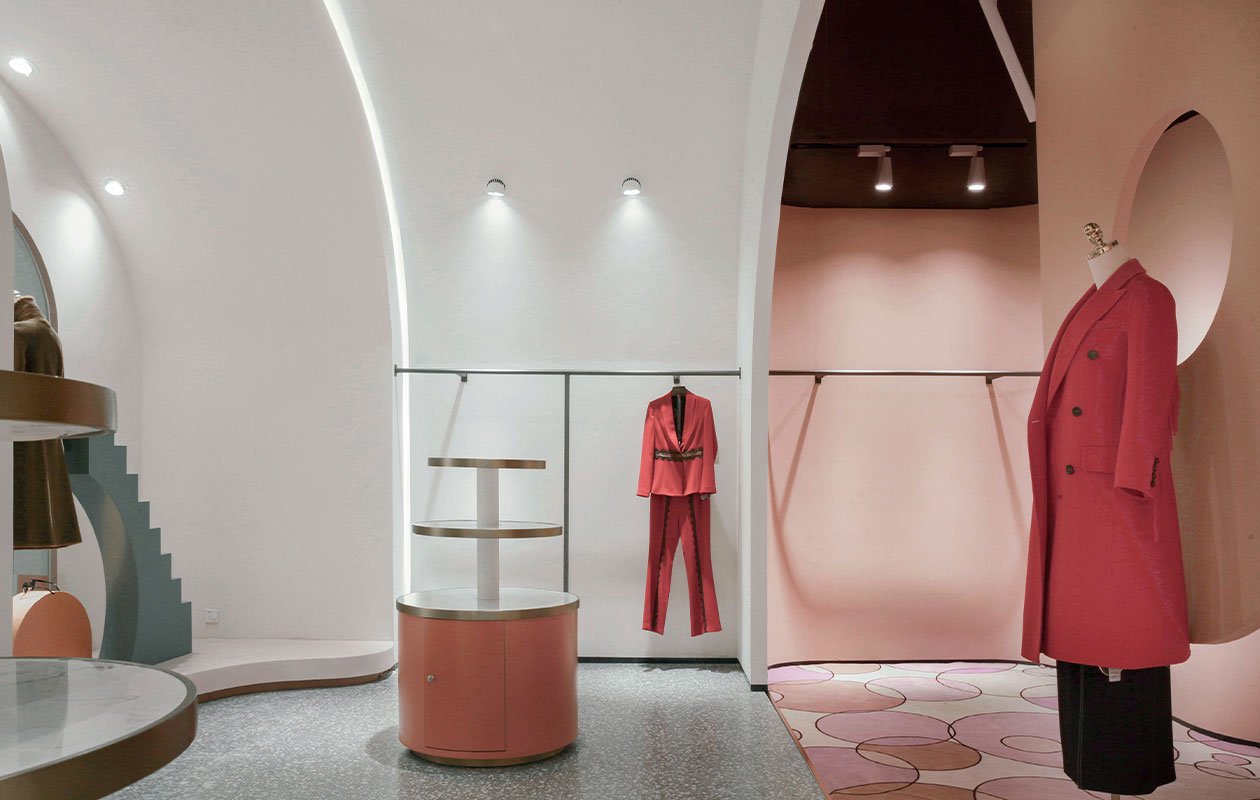 设计灵感来源服装的布艺面料本身。我们从中提炼“曲线”符号,构建曲面空间。步入室内,仿若置身于一个极具动感的空间,搭配的高级空间色彩,使人通过感觉获得对产品的印象,进而对品牌形成新的识别与认知。门头设计,打破千篇一律的大开门形式,而设计成中间对称的“M”曲面造型。门口设计在正中并后退1.2米进入,不求夸张的和谐色彩与柔和的灯光表现。入口两边为曲形橱窗,强调内部空间与商业街区的间隔式设计。各种材质的质感、色彩、线条、形状的重复组合,构成富有艺术情调的展示空间。在入门前厅展卖区,我们沿用曲面元素将前厅设计为弧面穹顶,并通过两级墙面和天花的高低前后错位设计,丰富层次,塑造出独特气质的流线之美。衣架陈列、层层叠展、卷曲造型等陈列组合看似随心所欲、实则独具匠心。圆形柜台的陈列以平面、立体、抽象、动感等形式存在于空间,无形中成了空间最有趣味的一抹亮色。中厅设计,我们大胆将左右两边货架展示墙化为两条自然弯曲的弧面布艺造型,所有货架以穿针引线形式插入墙体。收银台、仓库、换衣间灯功能区巧妙设置于转折处的空间,装点以高级的粉橘色系。前台设计为半包裹形式,传达女性“犹抱琵琶半遮面”的含羞之意,却又不失大雅。后厅展卖区为近马路次入口,作为门店形象及街边引流。西面与前厅一样为弧面穹顶,材质的肌理、色彩的渐变、光影的虚实、空间的层次、展品的精致灵巧、设计的精心与考究,无不使其呈现浓郁的品牌文化。