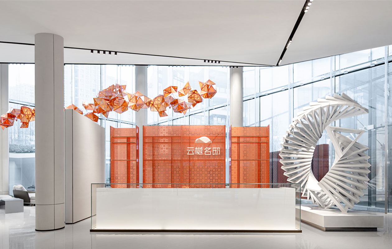 成都简阳,沱江之滨,朝晖夕映,山河醉人。成都旭辉碧辉园·云樾名邸售楼处,坐落于此,沿袭地势,取意山形,建筑融入自然,景观顺势而依,室内对话自然,设计师将特定的历史记忆与纯粹的人文景观嵌入到项目之中,以城市概念而来的科技与价值选择结合,传达“斜山捧月,江映灯火”的诗性意境。