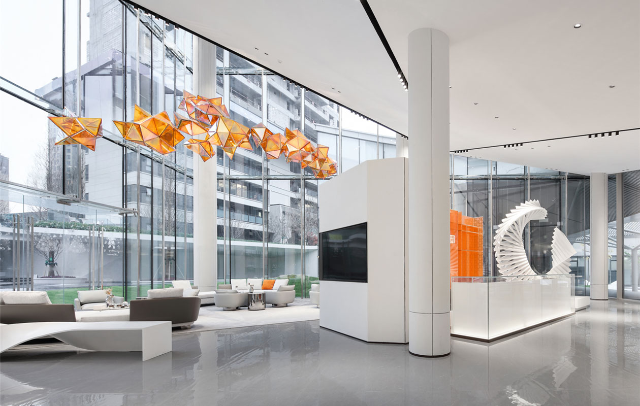 从园林小径往建筑方向望去,力量感的山形建筑立面、与韵律感的室内空间即开始引人暇想。接待前厅从建筑体块中提取元素,用解构的手法将其几何化与抽象化,室内空间的表现张力呼之欲出。对美的向往,是一切美好的出发点,而设计的本质是解决问题,则需回归理性平面脉落明晰,动线节奏合理,令参观行程可赏可读,是为空间设计的灵魂所在。