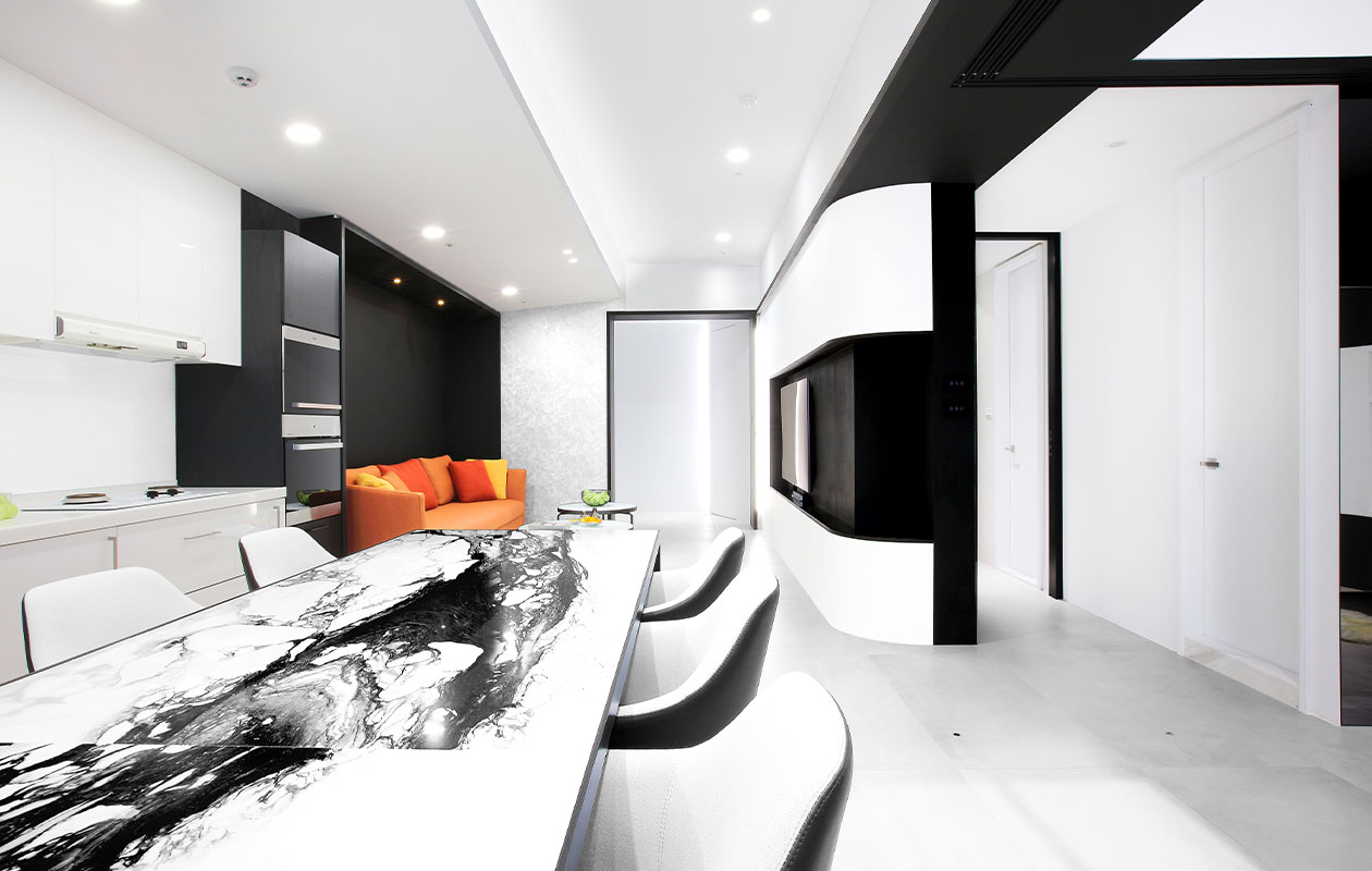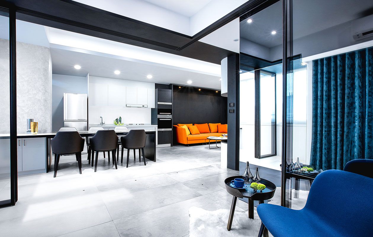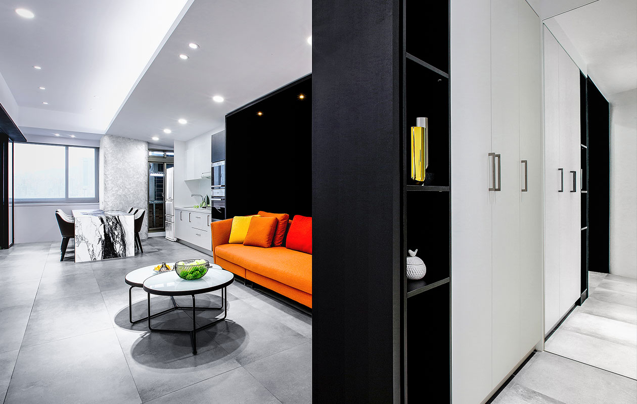 位於鬧區中30年老房子,約65M2大的空間中,由於擁有大面積採光,僅將書房與廚房局部隔間牆打開,讓日光可以緩緩延伸至空間的每個角落,在室內燈光部分選擇重點式的燈光照明,適度分散的在空間中,以不影響自然光蔓延在空間中,營造自然光線與照明光線調和之美。 將空間與空間相互的界線巧妙運用設計手法,將「虛」與「實」的相互交錯,進而重新定義各空間的分界線在這個項目的設計裡,我們在尋求分界清晰對比強烈的風格,實與虛的空間區隔、白與黑的顏色介面、橘與藍的傢俱裝飾。