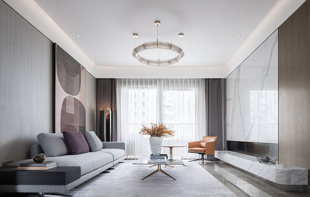客厅:平稳布局体现出客厅的气势,阳光穿透落地窗,品质的自由组合方式的意大利MINOTII品牌家具,室内少许原木色点缀其中,品郁的棕色,柔软顺滑皮革、层次立体感金属材料的交织,使得整个空间极富感染力。随钢琴声波光灵动之美,音符波动的艺术挂画,在空间跳动出欢快静雅的氛围。大理石背景墙映入眼帘,其华美天然的纹理宛如一幅精灵般的音符画。品质的美感形成空间成熟内敛的气质。