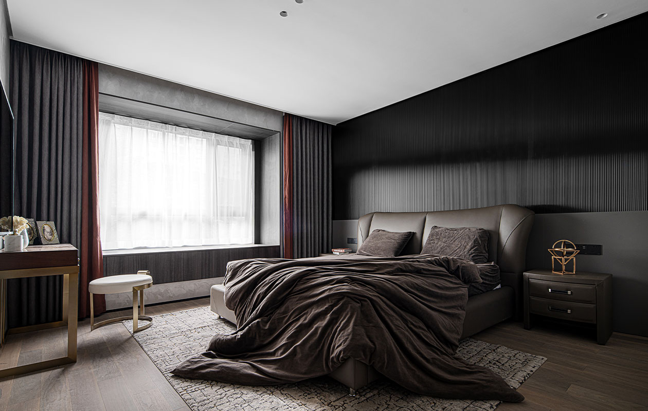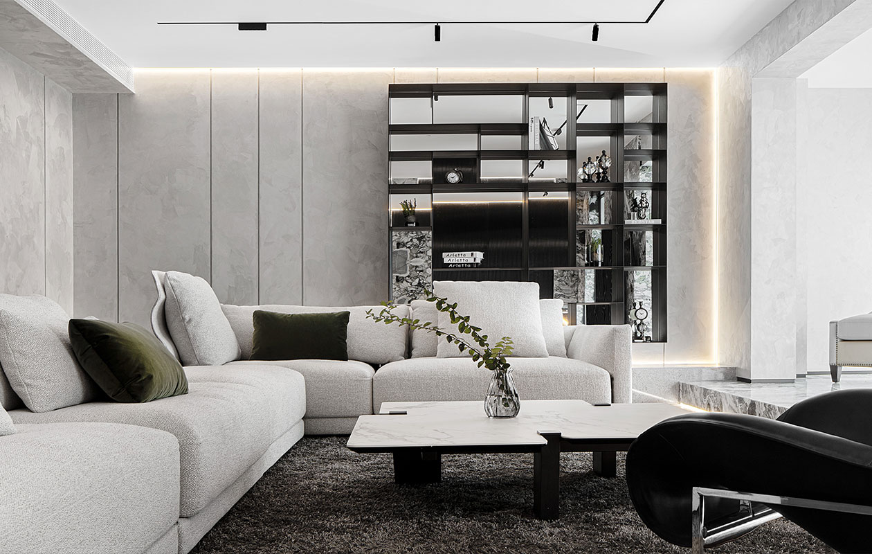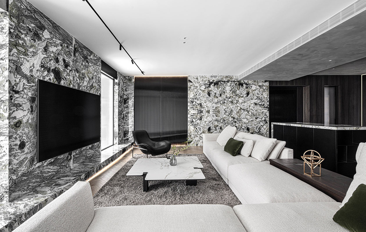 笃定的规划出屋主的别样居家动线,眷恋从视觉到触感中展开,居住愉悦的程度更加深一层原始入户缺少收纳空间,因此,设计师将厨房后移,设计了收纳伸拉柜,打通洗衣房并入厨房空间,将客厅空间全部打开抹掉空间细碎感,打破传统的客餐厅的规划放置,90度转角纵向拉伸最大限度地安放客厅空间,打开客厅阳台,原本的小窗户改为落地窗,地台错落而起,中置的电视墙让空间设计灵动,屋主喜欢极简的质感,但不希望四白落地,因此设计师用大面积的艺术涂料粉饰墙面,石材独有的艺术纹理让整个空间艺术但不生冷。