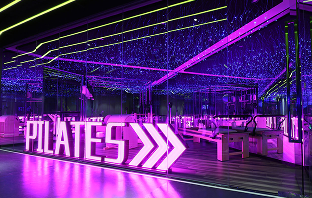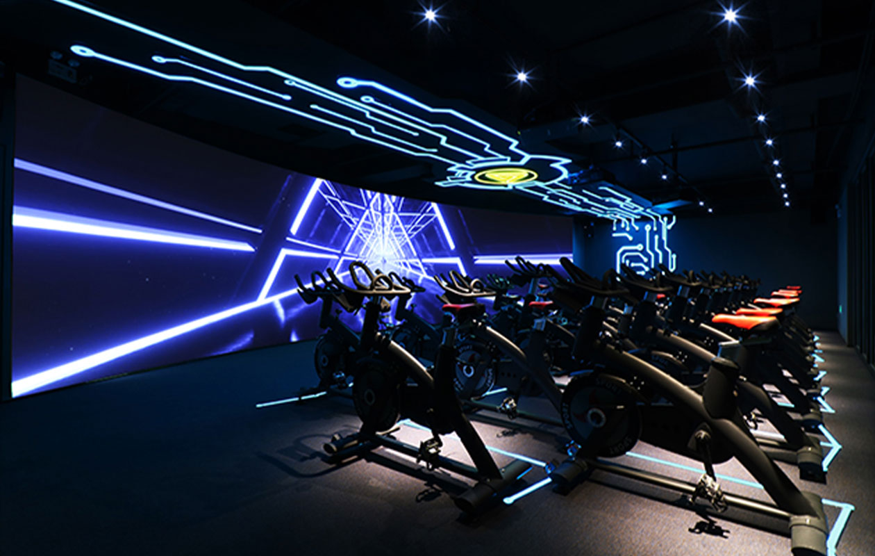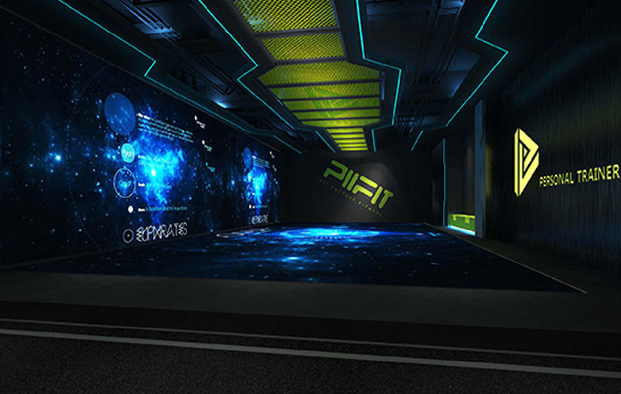 随着越来越多的年轻人出于社交、锻炼等等目的投身于健身房,PII FIT看中了这一时代潮流,为当代年轻人量身打造了一款超现实的未来科技主题健身房。该作品的主要创作思路灵感来源于电影《创·战纪》,在空间设计中,用黑色的基底色调与明亮的黄、蓝、紫色灯条相搭配。其中灯条除了塑造空间感与照明之外,还起到了室内动线引导的作用。该场馆各个区域的投影器材采用了180度广角无缝投影的特殊技术,保证了更加沉浸式的体验。考虑到不同的健身区域的男女比例不同,PII FIT针对每个区域的设计风格都略有不同。例如女性顾客较多的普拉提房,设计师选择了星空顶搭配粉色灯光在烘托氛围。男性顾客较多的单车房则大幅度减少了室内装饰,仅仅以灯条于大屏幕作为主体。而比例相对均衡的HOLOFITS房则采用了触摸屏地板,进一步提升了空间的科技感与客人之间的互动。