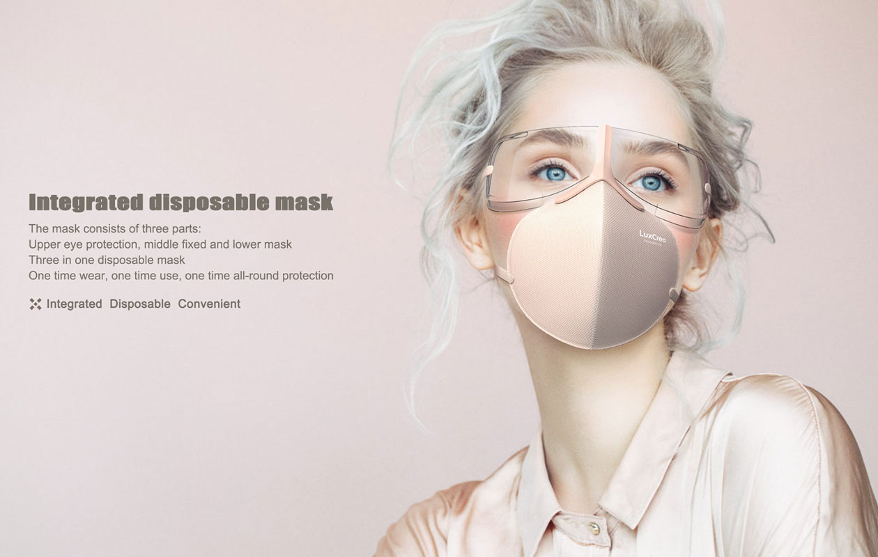 创新性:⼝罩佩戴更加简单,相⽐市⾯上普通护⽬镜与⼝罩分离形式的产品,体验更加简单,在佩戴时不需要分别两次佩戴⼝罩,护⽬镜,只需⼀次性佩带产品完成即可。