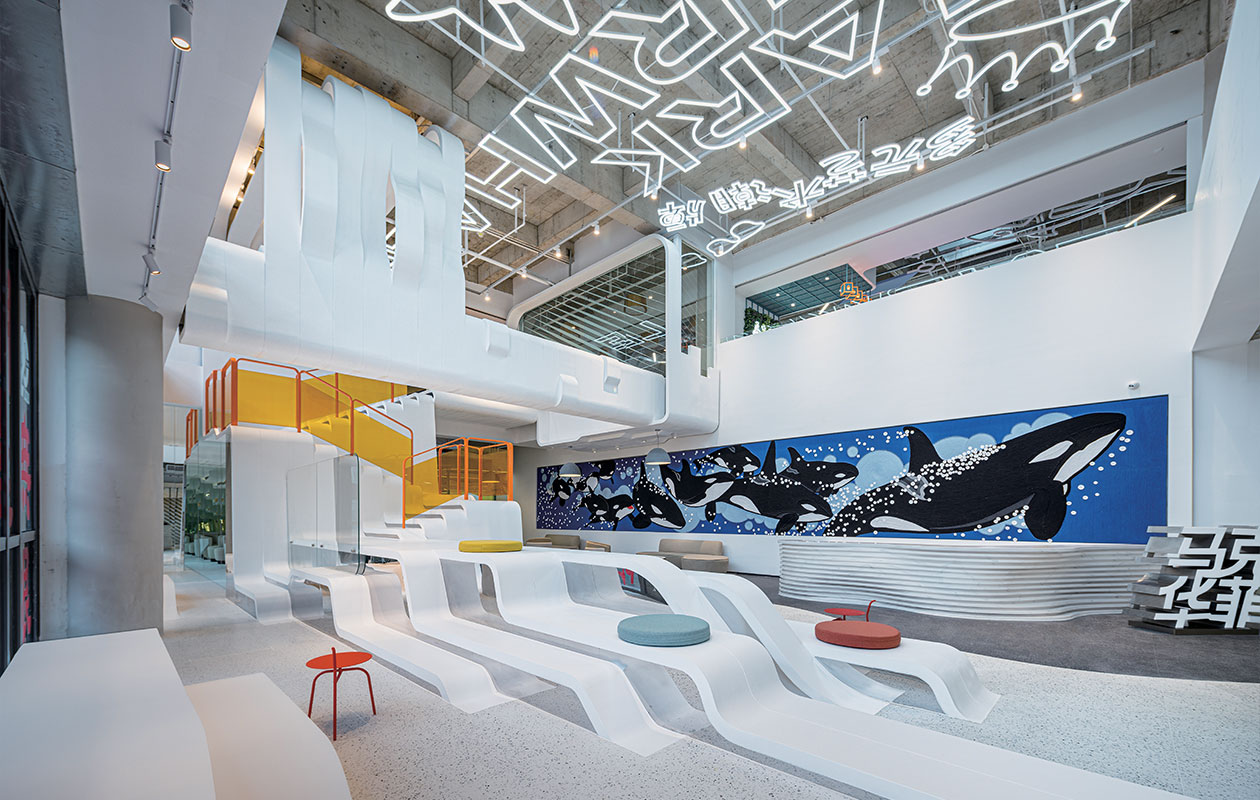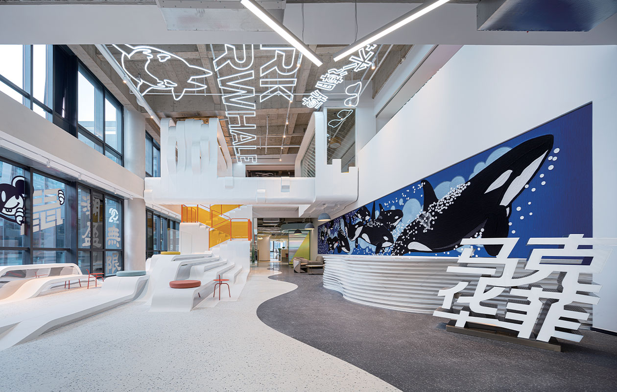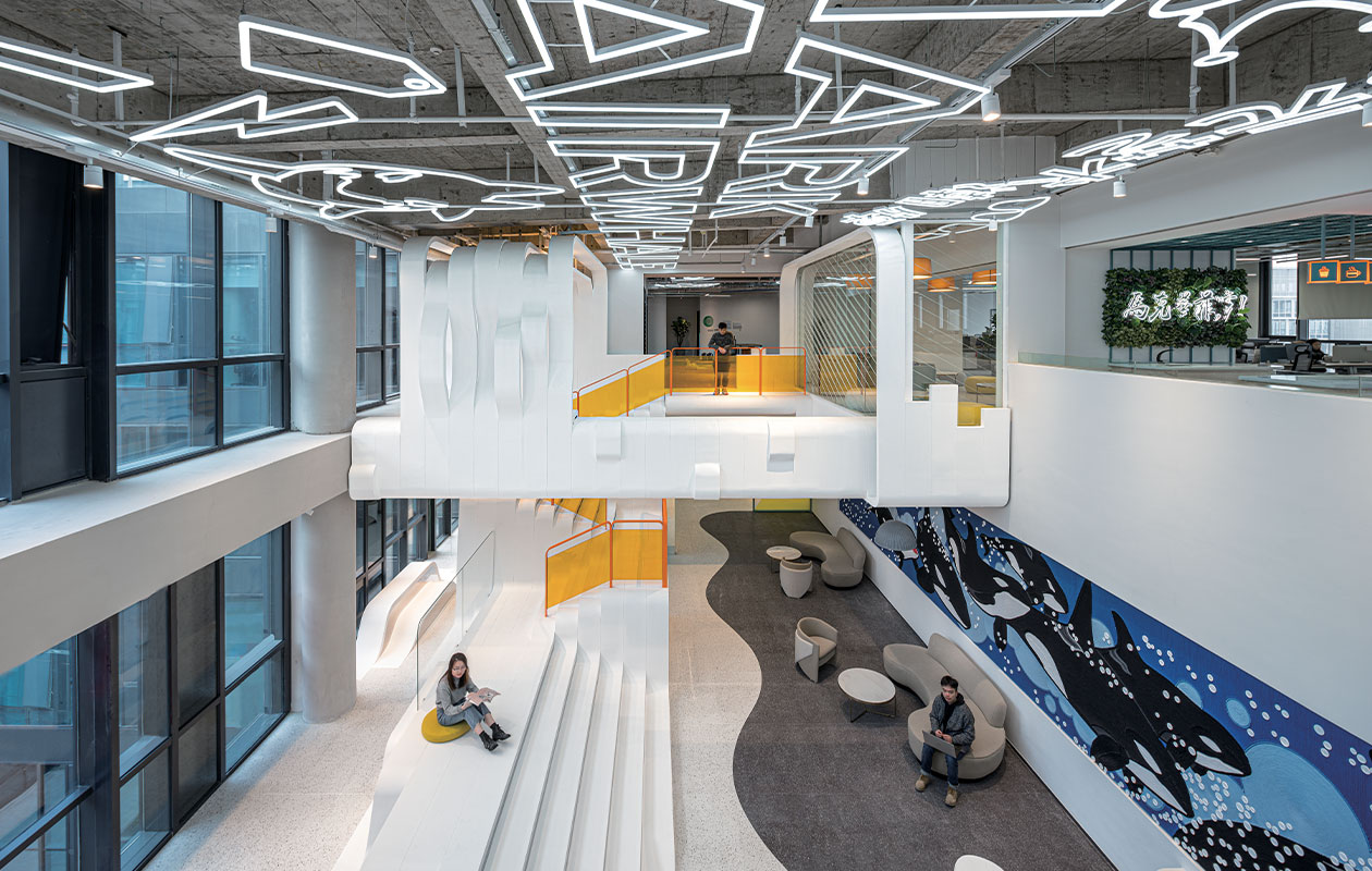 尖端时尚品牌马克华菲(Mark Fairwhale)的总部位于上海。该项目基于品牌文化基因,主要运用了水与鲸鱼的主题元素,并且创造出灵活而又敏捷的工作空间。同时借此呼应其新鲜年轻的风格定位。 整个办公区域都经过了仔细考量与推敲,以确保每个不同的区域都有自己独特的颜色区分。为集团旗下四个品牌中的每个部门品牌建立独特的视觉识别,为访客提供清晰的方向指引。开放式工位环绕空间四周,从而确保每位员工都可以同时欣赏天光和宜人的外部景观,同时倡导“非正式会议”,以促进员工间的高效率协作。 该项目的另一个重要的设计出发点是设计师期望将上海这个城市的活力与多样性引入并转化为工作空间的功能分布。 如同城市生态,办公空间亦成为交流互动的枢纽中心,移除大多数中国典型办公室的正式和过时的模式特征,设计师创造了可满足当代员工的需求的现代、创新和舒适的工作空间。这个开放的空间使人们可以在不断进化的组织环境中担当多种角色,为员工提供更多的自我管理权限,并方便员工们以一种更适合他们的工作方式来完成工作。 该项目的使命是使人们不再每日绑定在自己的办公椅上,转而使用更加敏捷的工作方式。除了私人讨论所需的灵活会议室外,工作环境在视觉上开放无边界,创造了令人惊艳的现代化,员工友好型工作环境,在此环境中人们将始终以最饱满的状态进行工作。