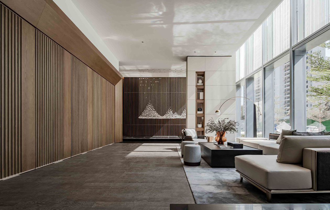 山林与野石,不必多。山林之力道,野石之张力,形成与空间的对话,有形中诉说对时光的无畏,无形中温情建筑的冷峻。家具摆设均呈端庄格式,金属与皮质,石材与藤编,虚实益彰,刚韧并济,尽显现代东方祥和之气。