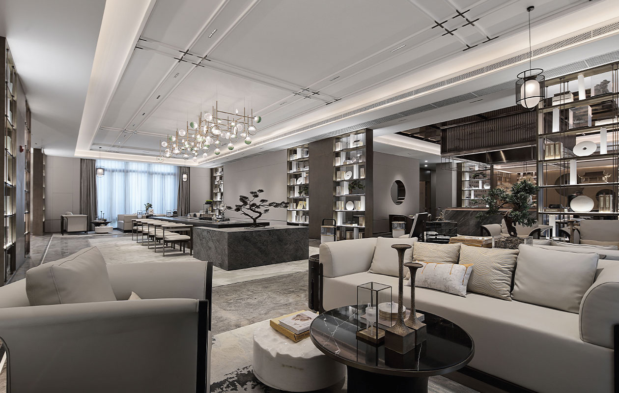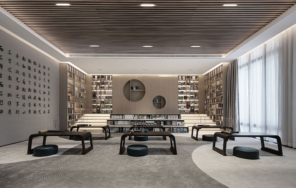 竹雨松风琴韵,茶烟梧月书声,设计从清代诗人溥山的诗句中提炼出清雅有韵的东方语素,将现代主义的简约纯粹择善而取,以折衷的手法有层次地糅合兼收二者,将传统美学渗透进山水城市生活的日常之中,营造朴质幽然而予人安适舒惬之感。