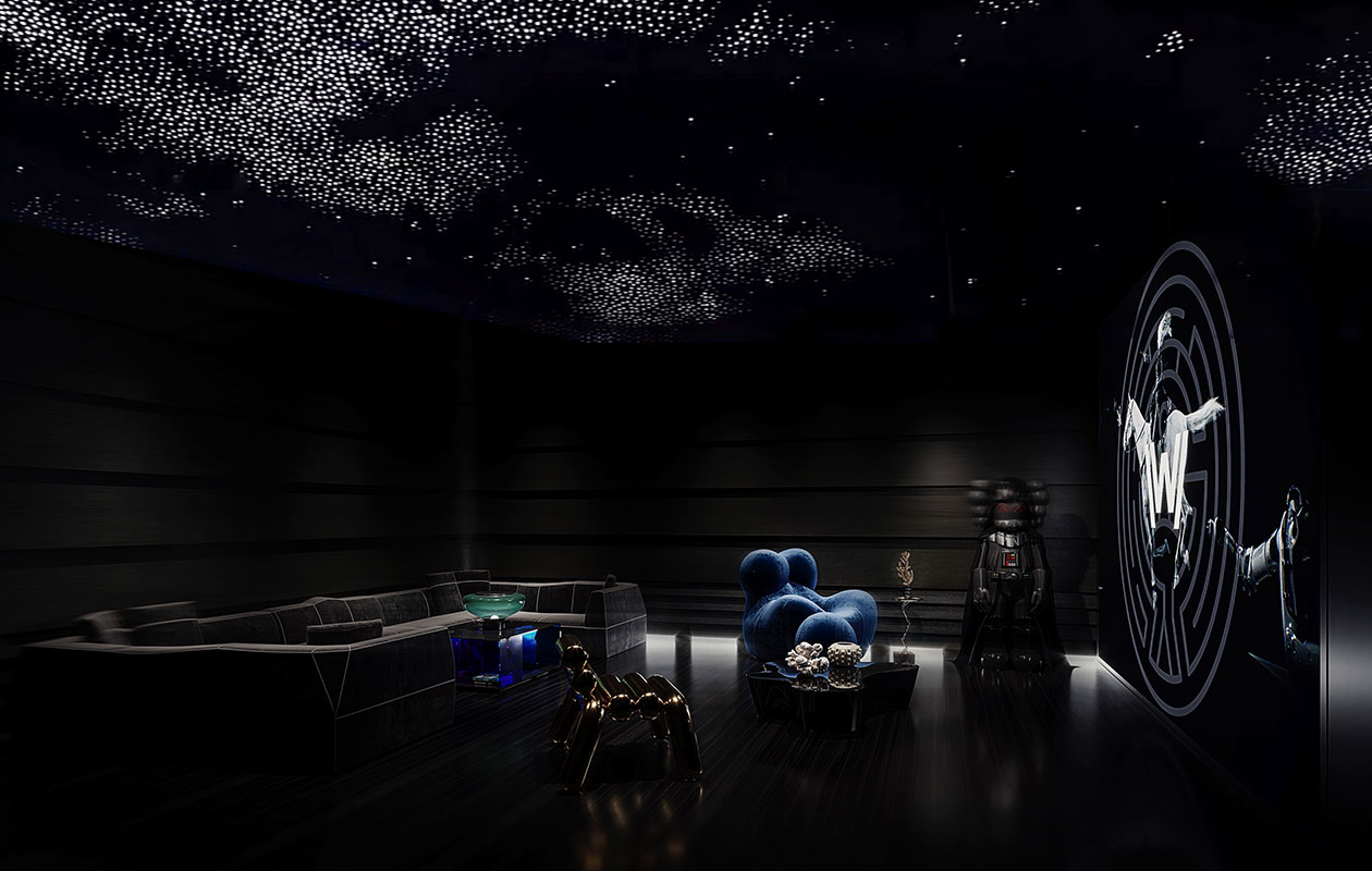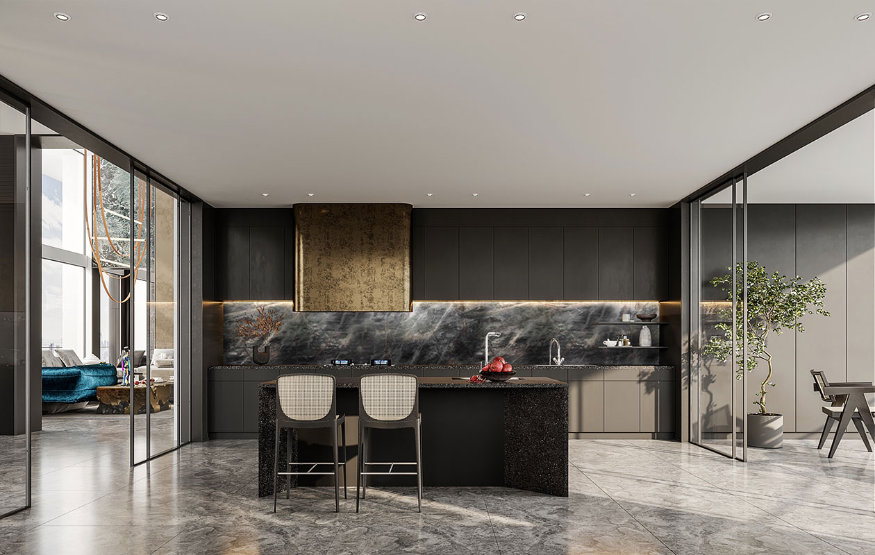 这个案子实现了我的很多想法。业主完全认可并尊重我的设计。让我充分发挥我的自由,在色彩和材质上都很大胆。设计灵感来自大自然。里面有很多天然元素,如粗糙的火山石、铜板、原生态木贴面等。各种材料都要经过比较,碰撞、天然纹理和石材纹理赋予空间持久品质。像梯子一样,石色古朴,融于山水之中,其意境古朴典雅,让自然与时尚交融。
