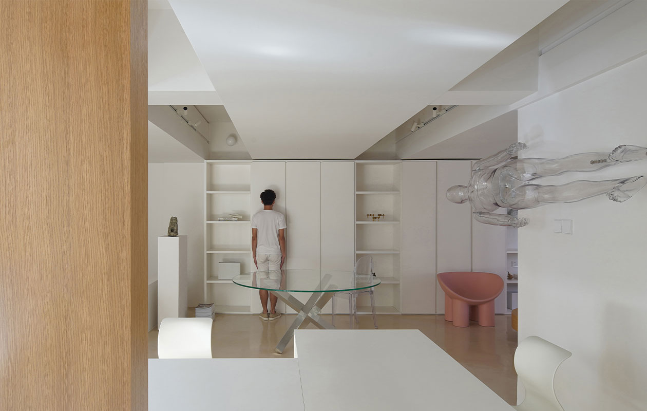 我们尝试将Studio空间塑造的如空气般的感觉:客观、同质化、具体又抽象。它不述说什么,身在其中犹抽离至匀质时空之感。 设计者通过对空间比例的控制及对自然光线(作为至关重要的材料)的绝对遵从与把握,为Studio赋予了一种身在其中,人与物同质化的氛围。人与物品各得其所,无主从关系,被唤醒的物品每天都散发着新鲜的感觉,人在空间里对物的感知得到了充分的开发。 墙体转角位置挂着一个透明人装置,部分身体悬在空中,与阵列天花造型平行:一是强调空间的水平方向上的拉升感;其次如设计者所愿,它在“游戏”空间重力的同时,带来了一些趣味性与艺术性。 设计者尝试通过对场地的干预,顺势,抑或强势,与原初的空间结构达成某种交易,取得平衡。这是一个关于“物”的能量场,设计者对空间的打理乐此不疲,这是一场在内外之间,宏观和微观之间寻求平衡的,无休止的游戏。