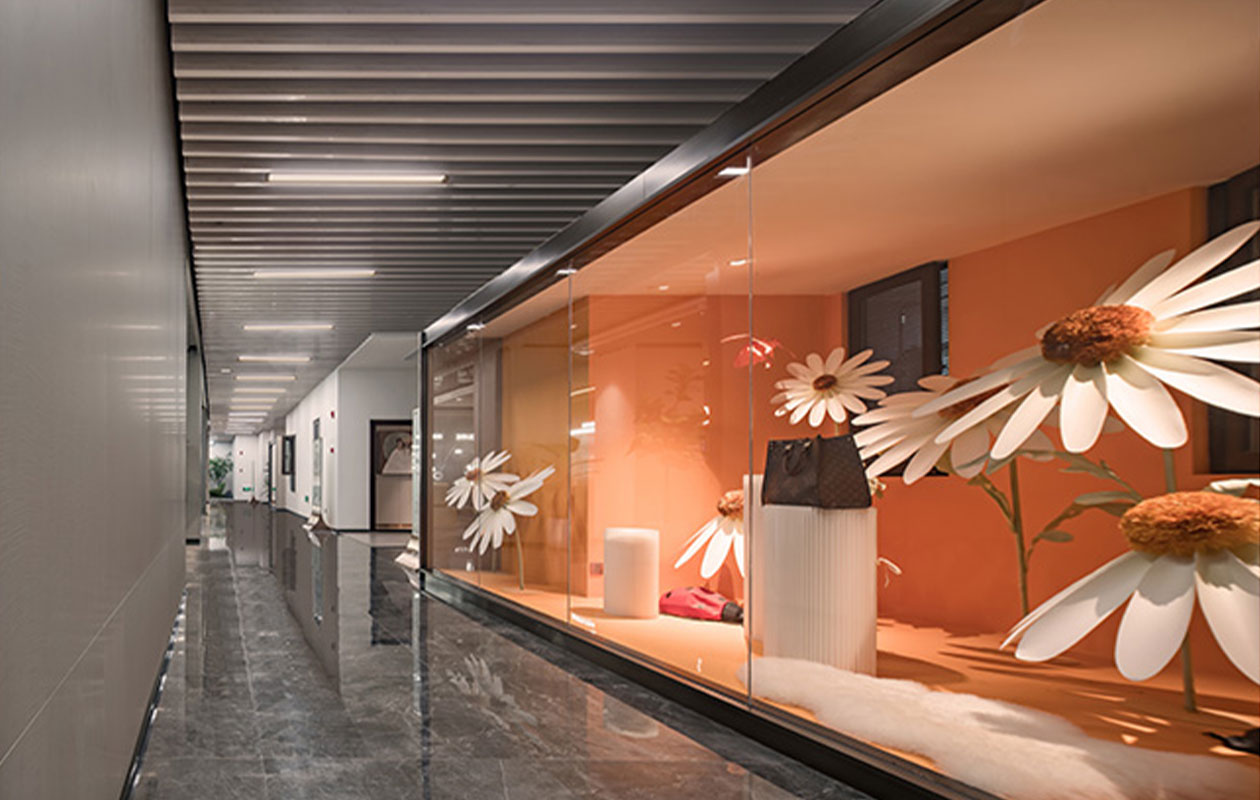 入门,黑色金属背景墙进入视线,上空金属框包裹的透明玻璃宛如一个“盒子”悬浮在空间中,在此刻,设计师使用体块穿插手法的成熟已经显现。