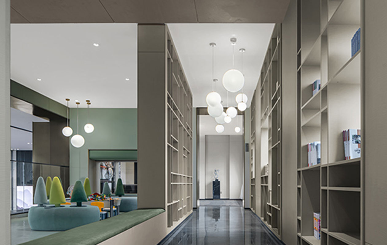 进入售楼处,整体空间中空挑高,设计师利用建筑的体块感在空间中进行穿插,制造出空间平衡的层序性;大场景气度不凡,小空间也耐人寻味,二层精致的生活体验馆以“空间盒子”的形态穿插在空间中,设计师用代表生命与活力的绿色作为生活体验馆主题色,随处可见的绿色装饰让空间充满年轻的语言。
