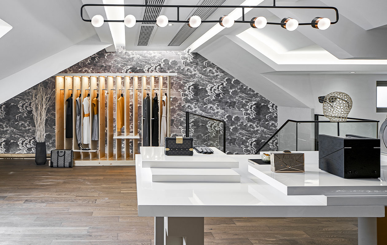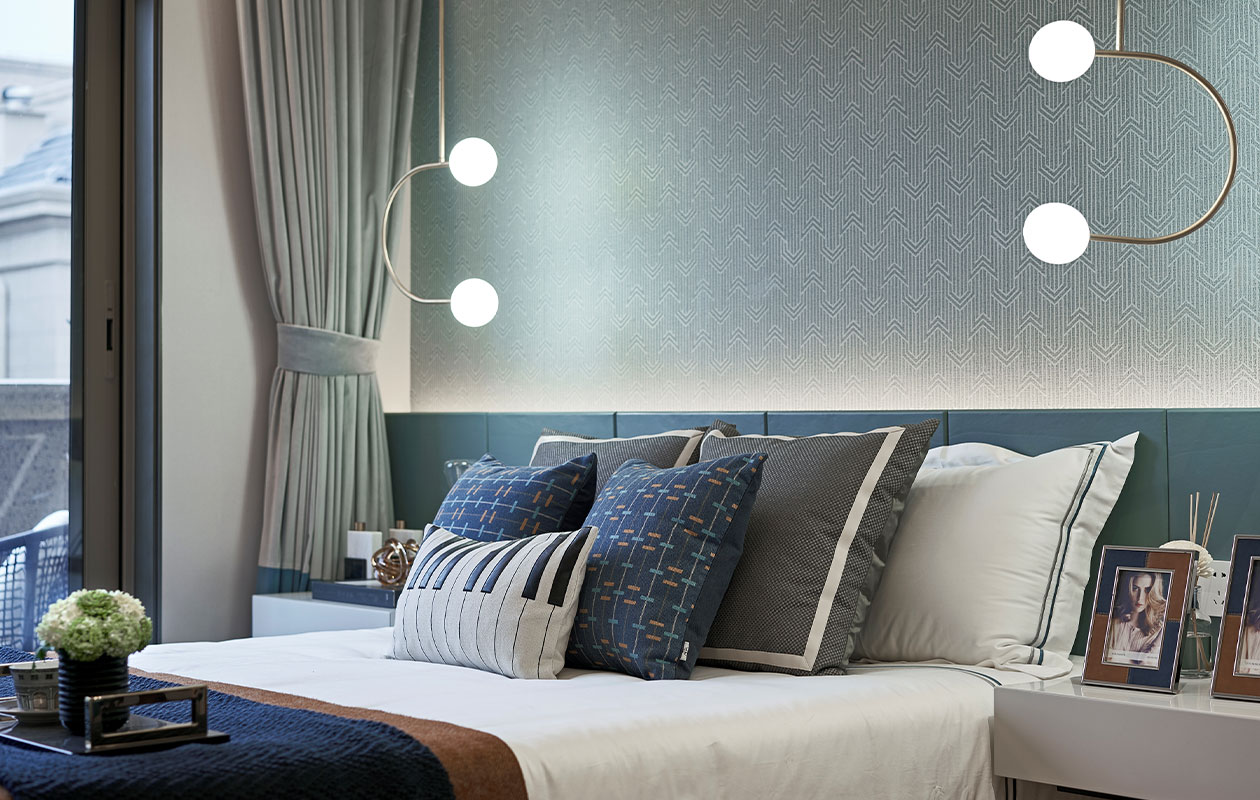 苏州融创御府上叠户型位于苏州盛泽湖畔,该作品是一款纯作为展示用的创意样板房,在设计之初,业主方的要求是打造出一间舒适,清爽的空间来打动当地的意向用户。设计师在实地考察此户型三层复式的空间结构后,觉得应该好好利用这种复式结构,拓宽纵深,增强空间感,然后再通过配色与软装的搭配来达成业主所希望的宁静与舒适感。思考过后,设计师选择了以相对素雅的色调为基底,现代极简构成主义作为主要设计的思路。利用适度的留白手法与矩阵式排列使得整体空间在视觉上更加通透,舒适。在色彩构成方面,以温和、百搭的浅灰色作为整体色调的基底色调,并搭配藏青、橙灰、暗金等低纯度色彩的跳色。这种搭配在保持了一定的含蓄、宁静感的同时还能使视觉观感不至于过于灰暗、死板。为了进一步增强这部作品的空间感,设计师还在客厅、阁楼等墙面的设计上,采用了简约的块面感对应规则方正的软装排布。