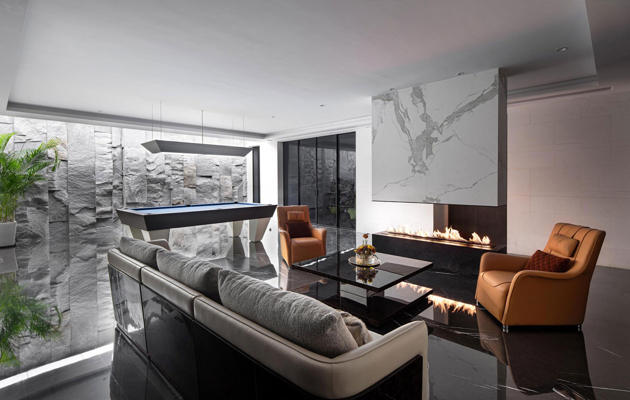 自然肌理的石材墙借由地面石材的镜面反射将空间的纵深感拉高,顶上的天光设计将地下室闭塞之感打破,让地下室重燃生机之意。