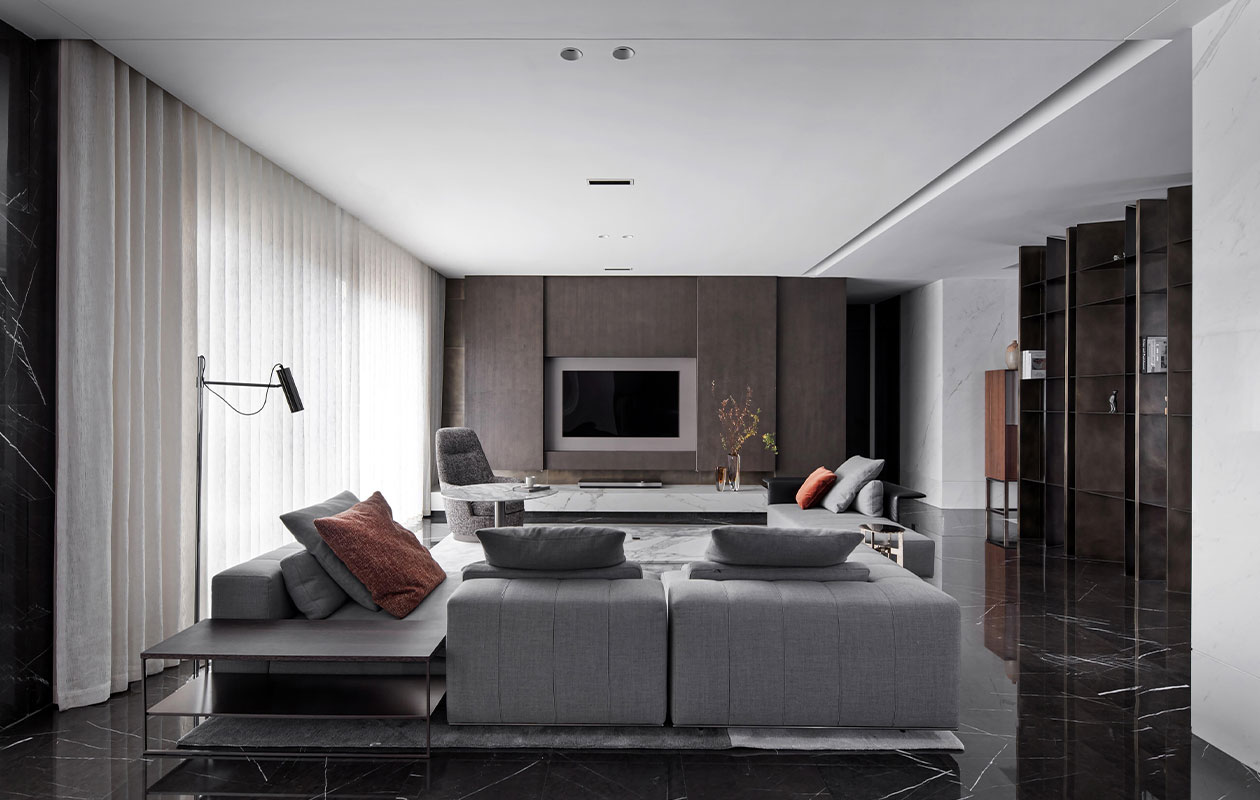 一个家的客厅承载的东西深厚,去繁化简是我们设计的侧重之重,家具之间的动线自由,随性。