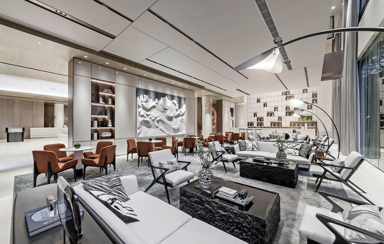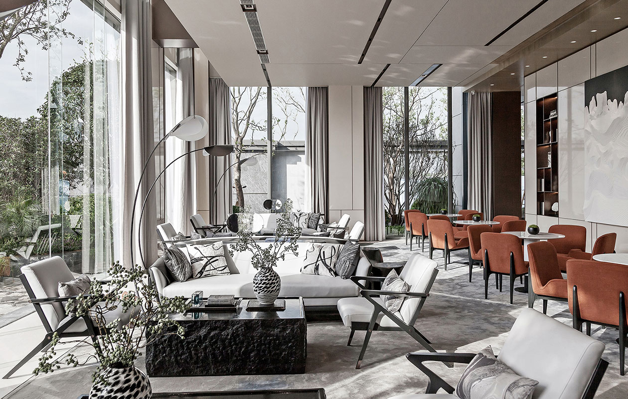 洽谈区晴明可辩,浅绛黑白家具的选用与灰度背景叠合出丰富的色彩层次,点缀出明晰朗阔的开放空间。阳光透过大面积落地窗,映衬出光与影的魔法,也让窗外园林的景致一览无余,围合出轻松舒适的洽谈氛围。