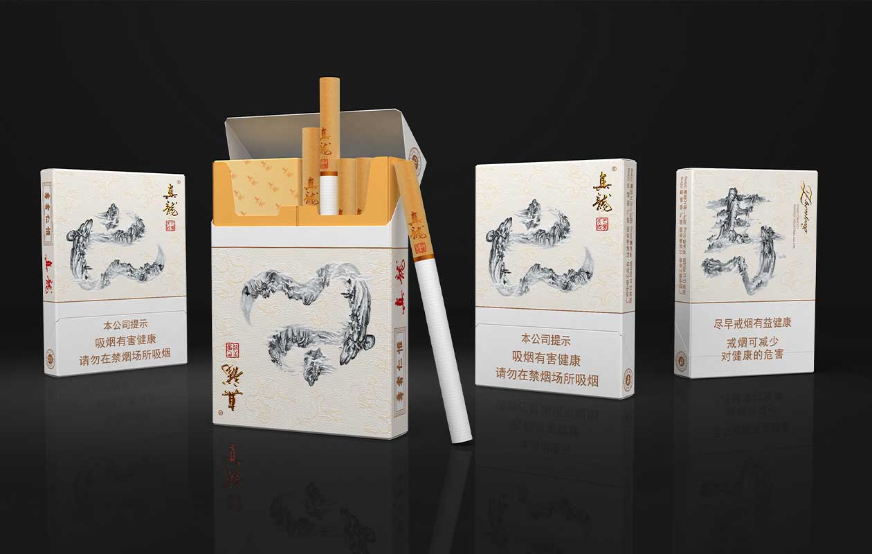 作为中国著名的长寿之乡,巴马是广西“十佳休闲旅游目的地”。这款烟草外包装设计灵感便取材自被称为当地生命之源的“巴马命河”。该河造型特殊,蜿蜒盘旋,既似龙行又似草书。利用这个特点,在包装正面,设计师将“巴马”二字的草书与广西秀丽山水进行了结合,通过国画中山、石、云、树的笔法,将景色融入了字体之中。背面则对巴马命河进行了小写意山水的重新创作,呼应正面书法的同时,也增添了整体包装的意境与美感。