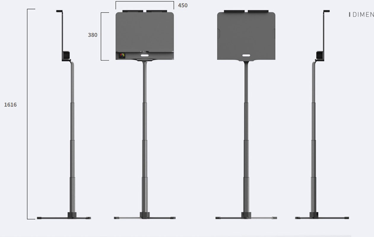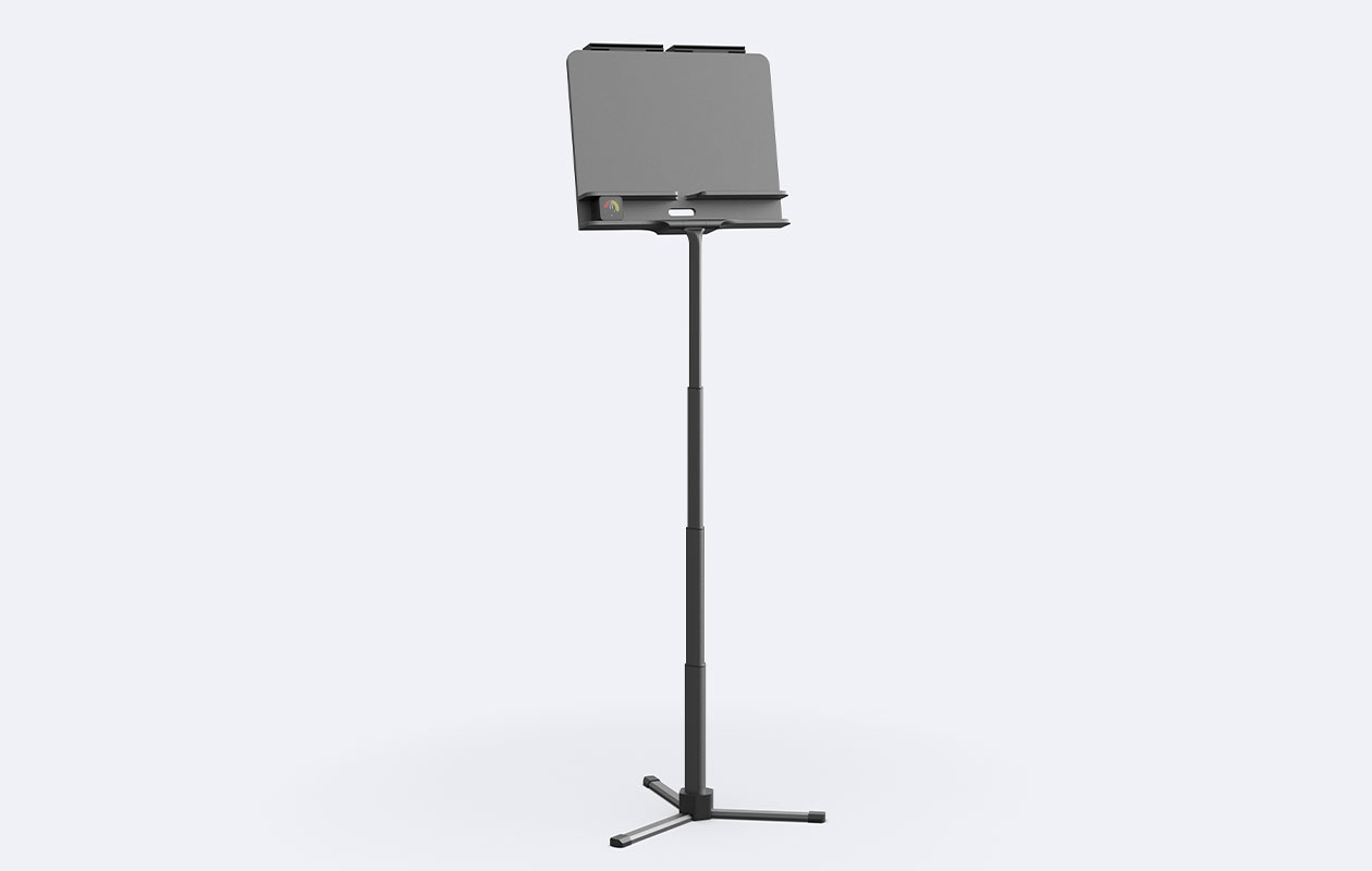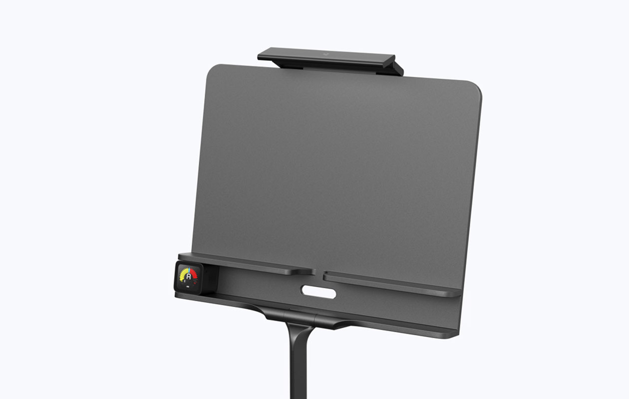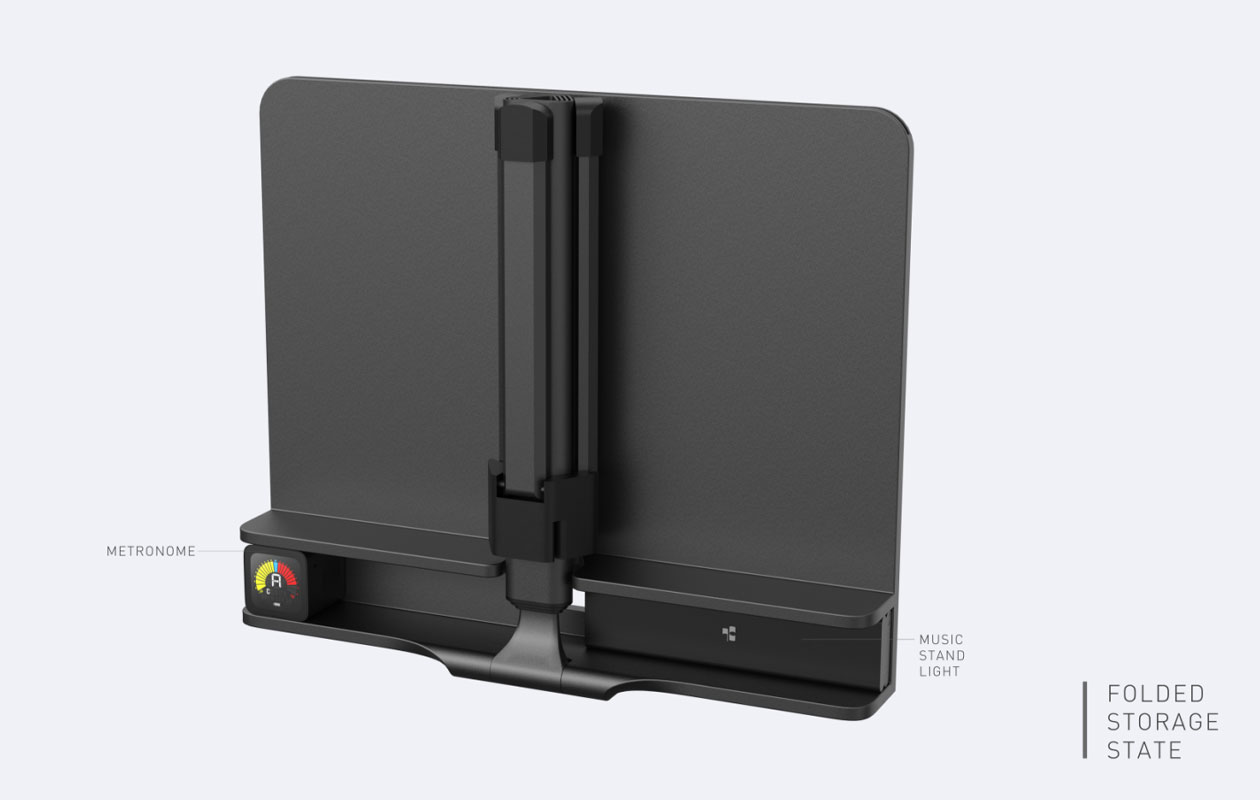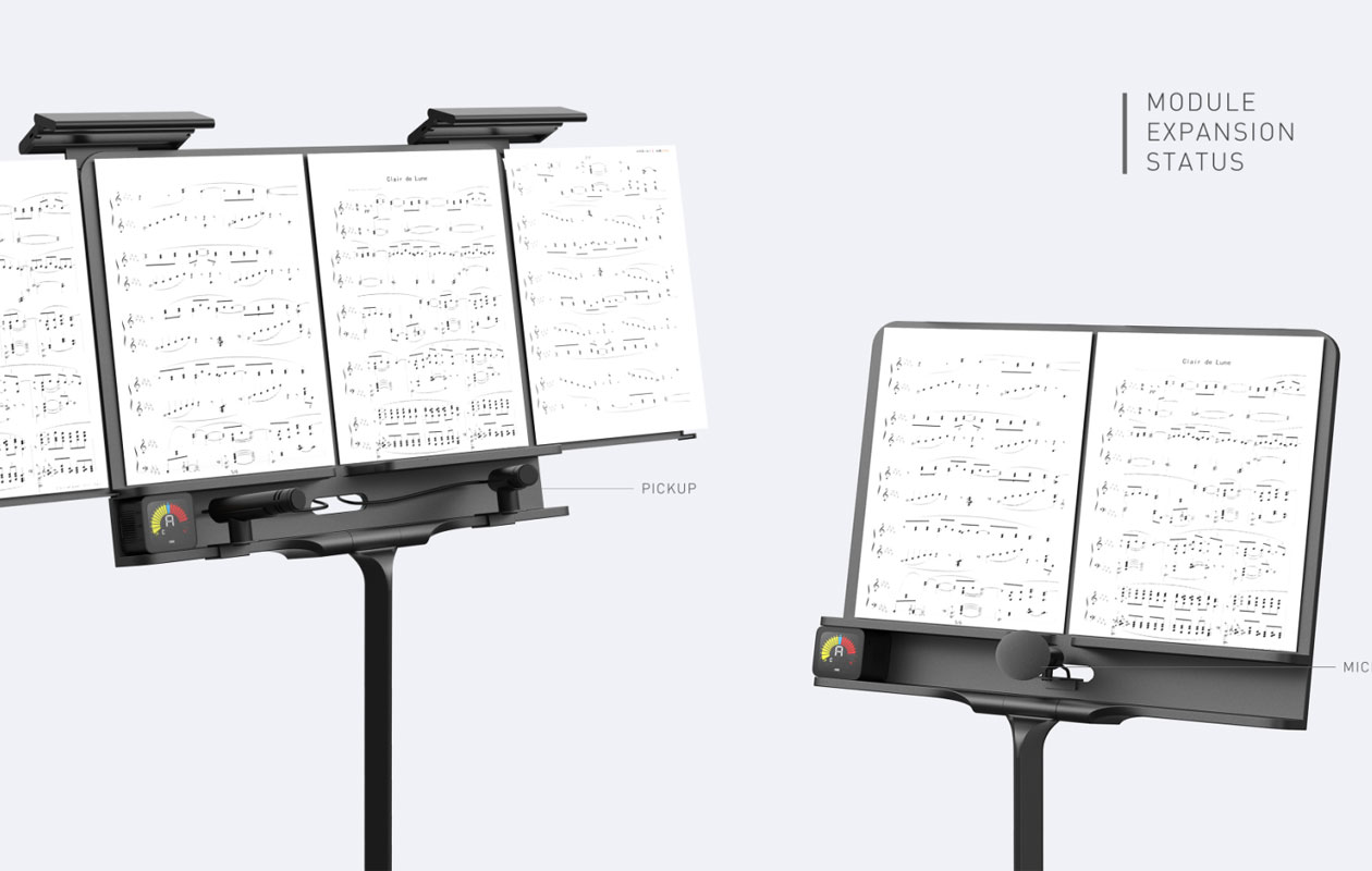 当前市面上出现的便携式乐谱台普遍存在质量差,价值感低的情况。演奏者需要个演奏配套组件如节拍器,谱台灯,调音器都需要从不同厂家获取,给消费者了带来采购以及配件风格不兼容导致练习演奏环境杂乱的烦恼。该产品希望打造一个有具有音乐工作站属性的乐谱台,使得大部分音乐配件都能够和谐的与乐谱台进行模块化整合,并且方便调整更换。通过将节拍器和乐谱灯等必备音乐演奏配件利用模块化组合的方进行整合设计。通过简洁自然的人机交互,为演奏者打造便捷、协调、自由的使用体验。