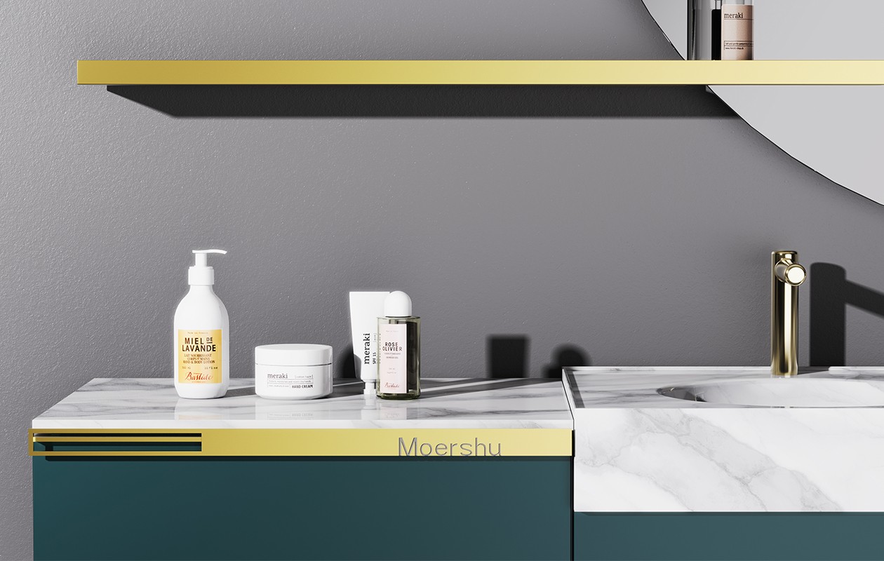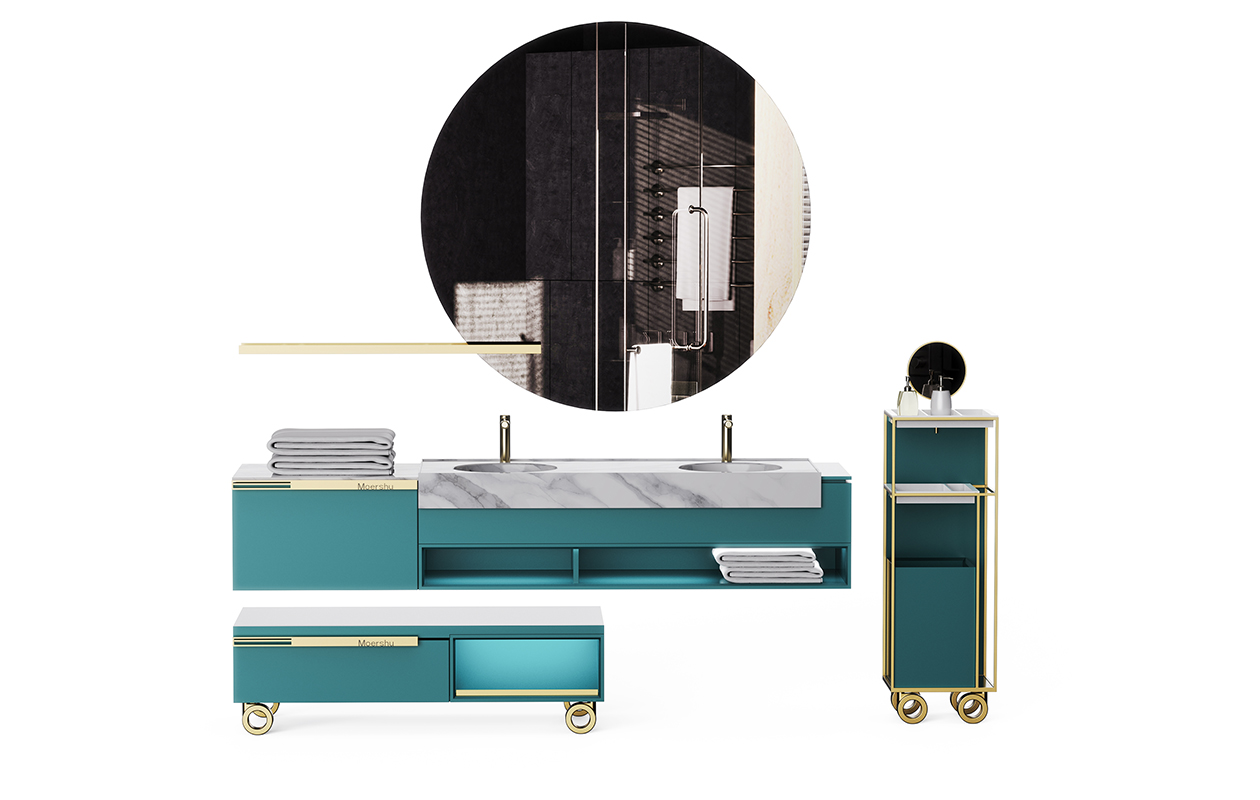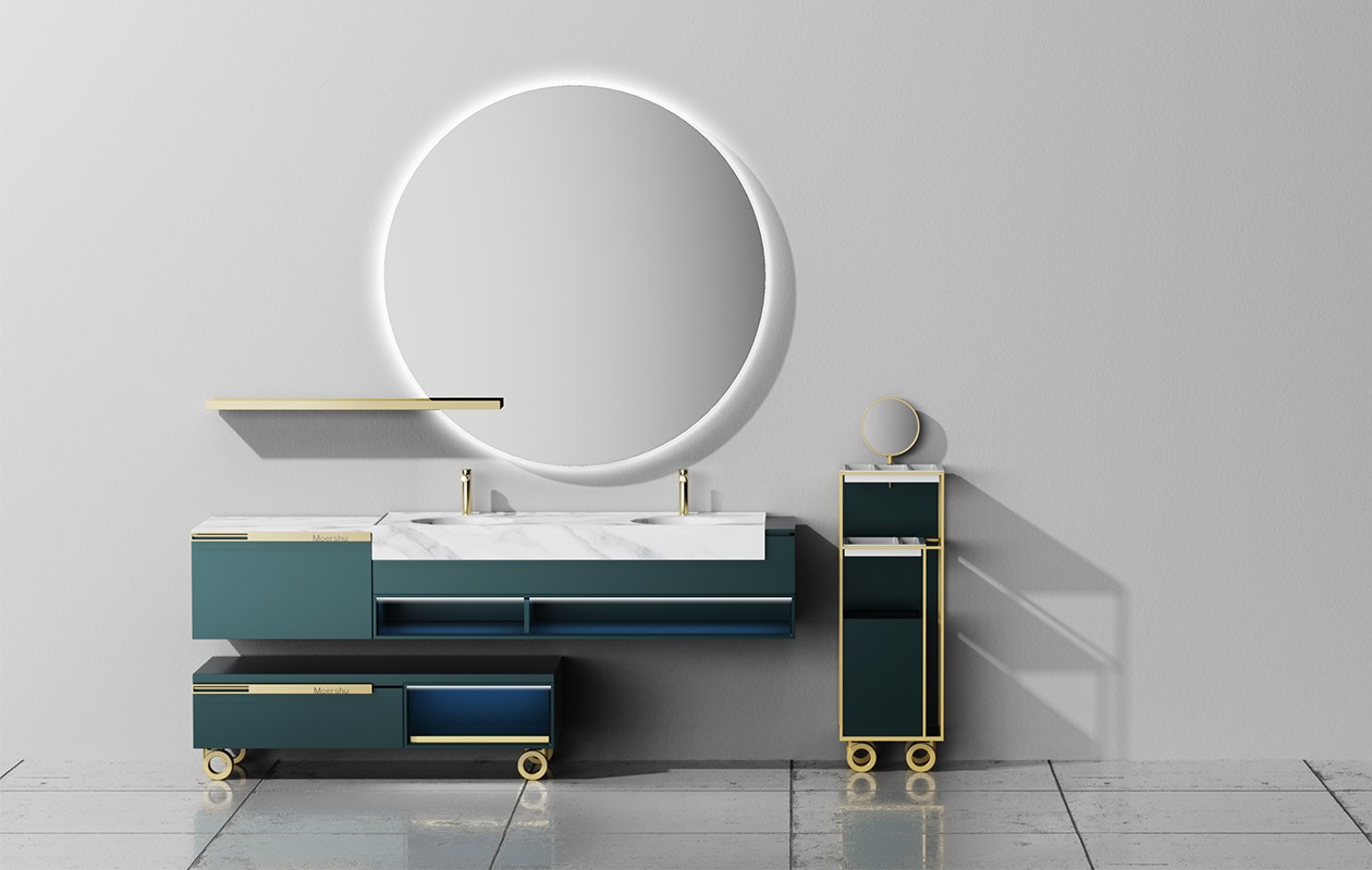 基于新的空间管理概念,浴室柜的设计摒弃了传统呆板的设计,通过置物系统的组合,赋予空间新面貌。圆形的镜面像是徐徐升起的满月,独特的镜子置物架为其增添设计风格和存储空间。多层圆角矩形收纳小格搭配大容量储物格,完美展示了副柜强大的收纳功能。