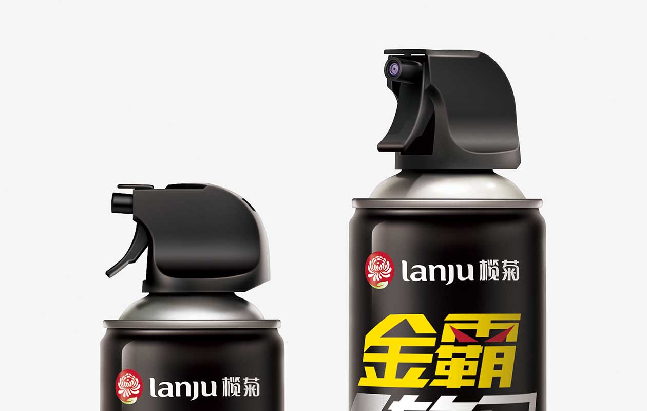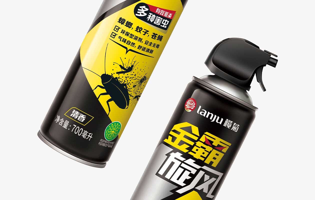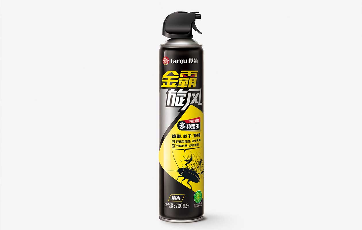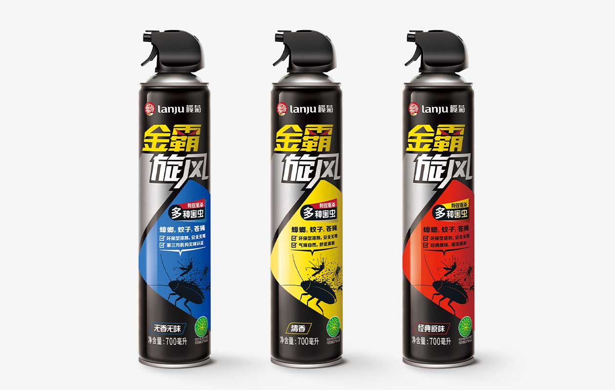 金霸旋风杀虫气雾剂是品牌在日用品领域推出的新产品。与传统按压式喷头相比,其采用了更易施力的手枪式喷头,能更精准地对指定位置喷射。包装上,标识中的“霸”字两点被替换为一双凌厉眼睛,象征着害虫在产品前无所遁形。主视觉图案融入了驱杀害虫的核心功能,蟑螂、蚊子、苍蝇三种害虫被喷射后消散的图样直观地向用户传达出其高效性。背景则采用黑底和红、黄、蓝色块的搭配,辅以高对比度的配色,创造了品牌独特的记忆点。
