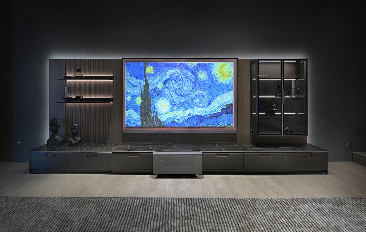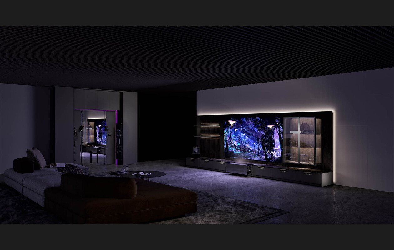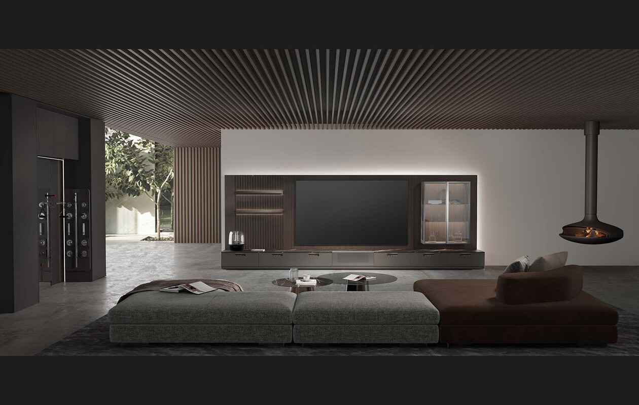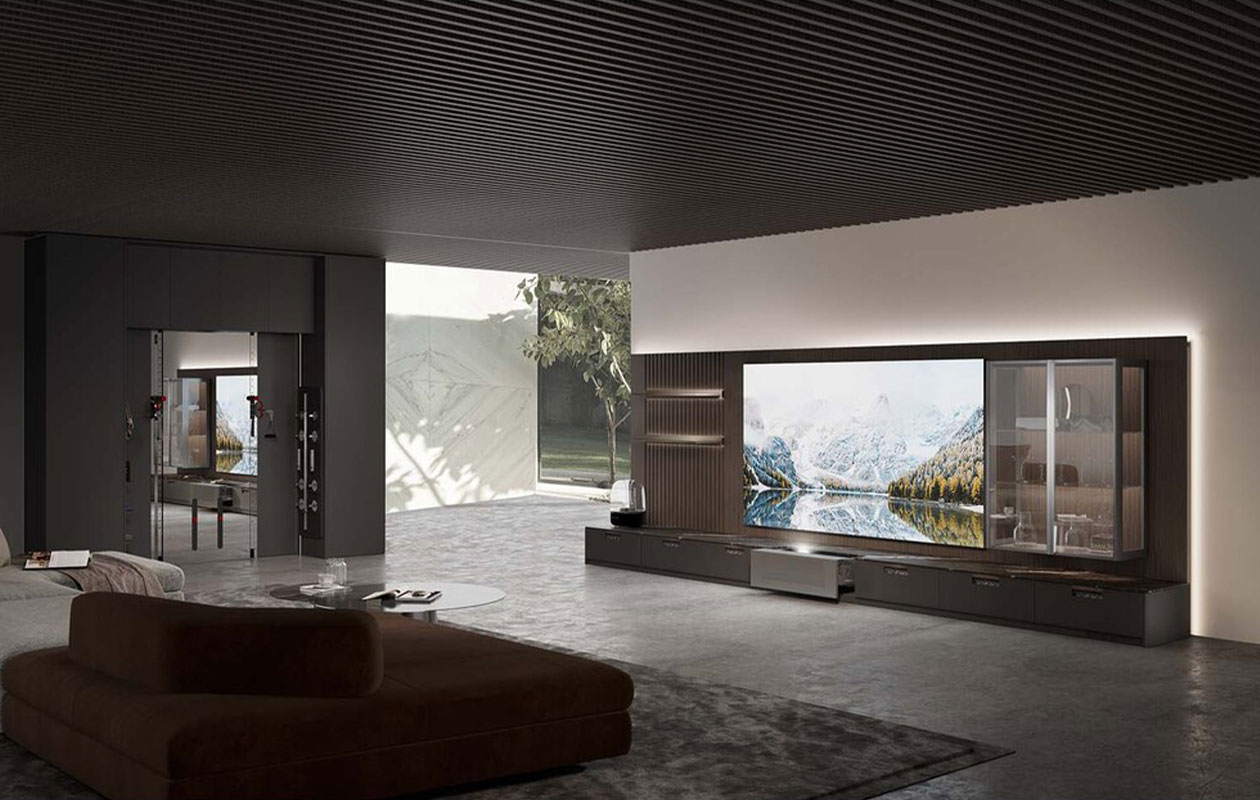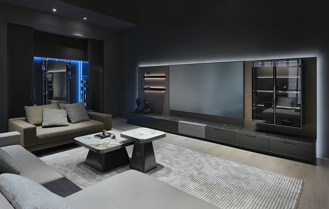 肖邦多功能会客厅主打都市浪漫理想家生活。引入创新材料进口水晶饰布,以满足追求浪漫仪式感的高精尖客户的审美需求。在生活方式上,结合现代都市人群健身与影音两大需求,创新研发激光电饰智能五金配件与健身柜系统,结合家庭储物需求,打造定制化娱乐空间,为中高端用户提供极致的居家影音健身体验。