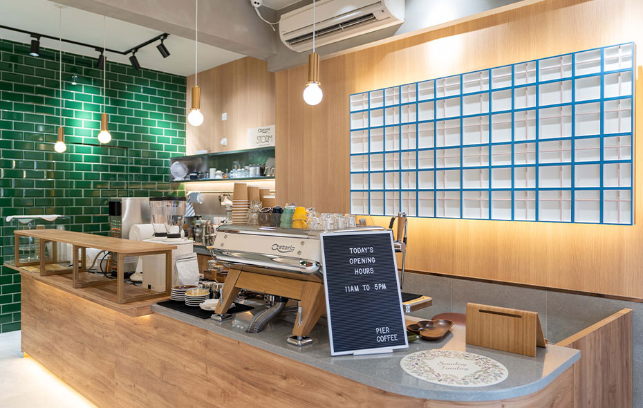 艾迪空间设计团队将这间位于凼仔旧城区一角的咖啡店从头到尾彻底大变身,打造出令人耳目一新的小清新工业风。呼应以环保为核心的企业理念,艾迪空间设计团队总监 Hero Chu,在保留原有的店铺结构下,不使用过多包装及建材,回归自然简单的面貌,以大量木作线条及白色系,构筑出清新无垢的清凉感。地面采用水泥地的形式为店铺引入简约的空间概念,没有多余的装饰,透过门口玻璃大门的几个小字,诙谐逗趣地宣示公司的核心价值。咖啡陈列空间里透过远近交错排列的格栅工法,产生通透又隐约的空间感一整片木作元素中,显眼的绿色砖墙搭配木纹墙纸,就像一棵大树,绽放出绿意盎然的生机。吧台区方,以一幅立体墙板擘划出一处手作咖啡料理空间,每个角落都藏着设计师令人惊艳的小巧思,也赋予展示空间更多元且完善的机能。