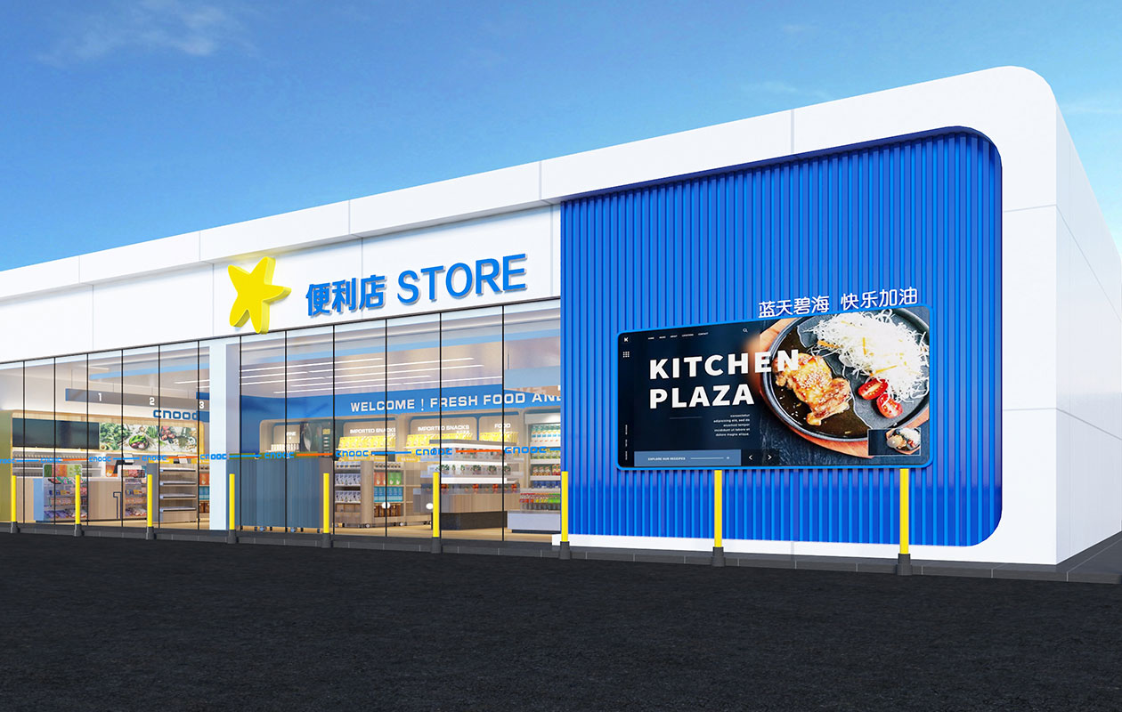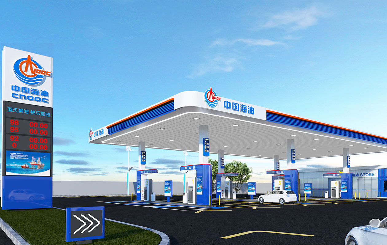 中海油加油站是国企中国海洋石油集团有限公司旗下的加油站终端。中国海洋石油是目前中国最大的海上油气生产商。为了体现该企业在海洋方面的造诣与贡献,为了传达现代、科技、高效的品牌信息,设计师沿用了其 LOGO 中的蓝色作为这款作品的主印象色。