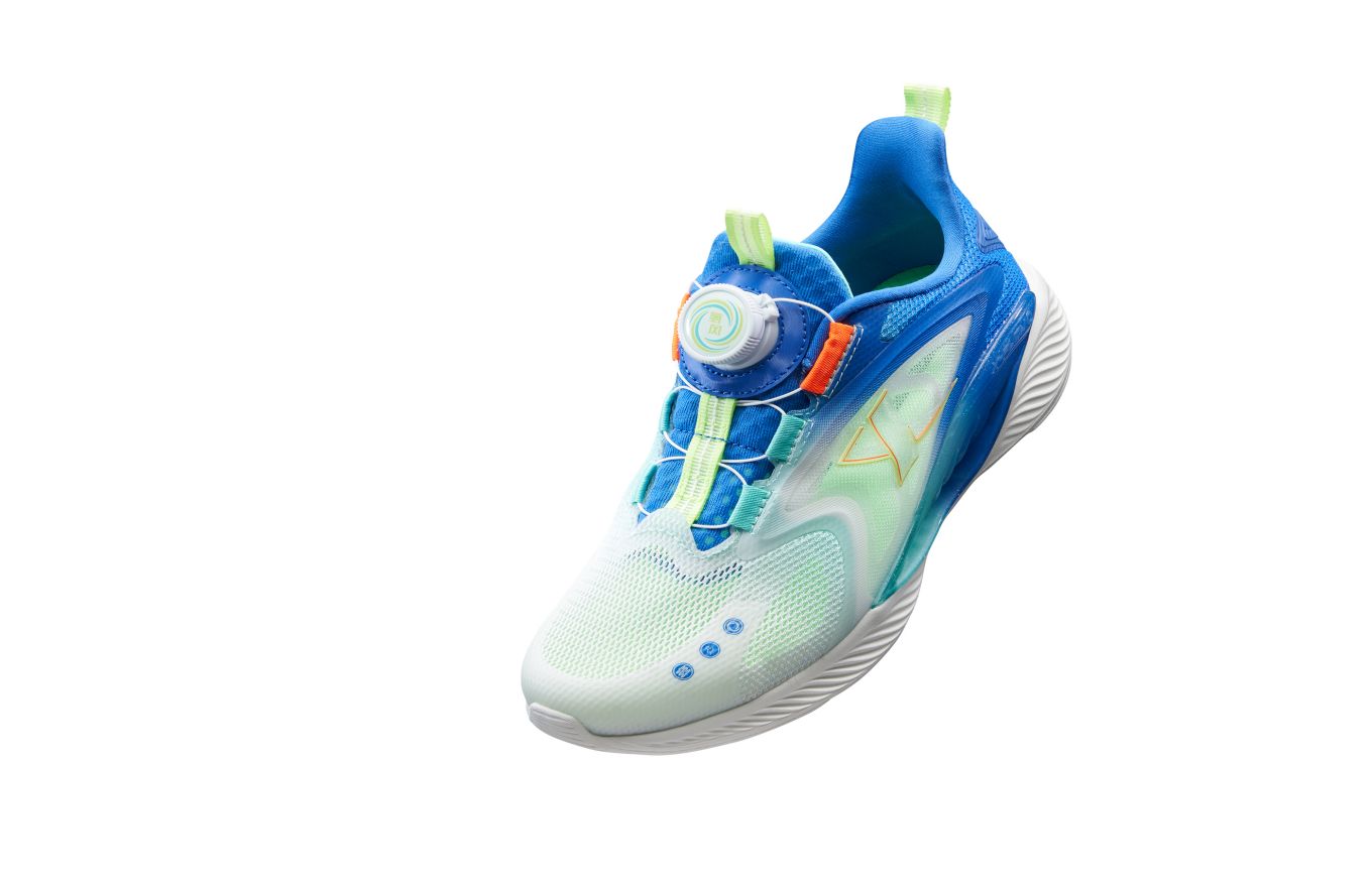 氢风跑鞋是主打透气、轻便、易穿的一款跑鞋。设计团队以鳐鱼轻盈游动的意象为灵感,结构上,采用中腰TPU开窗和底面一体设计,创造360°全方位散热系统,呼应游鱼在水中自由呼吸一般透气,确保轻盈缓震和安全稳固;外观上,采取了流线型设计线条,以治愈系畅销色为配色,搭配了两种材质的PP膜,亮面与雾面、透明与实色交融,兼具时尚美观。鞋面上加入了防污易去污工艺,更易清洗、好打理。旋转扣设计也解决了小学生系鞋带困难的痛点。氢风跑鞋注重人性化设计,旨在为用户提供舒适穿着体验。