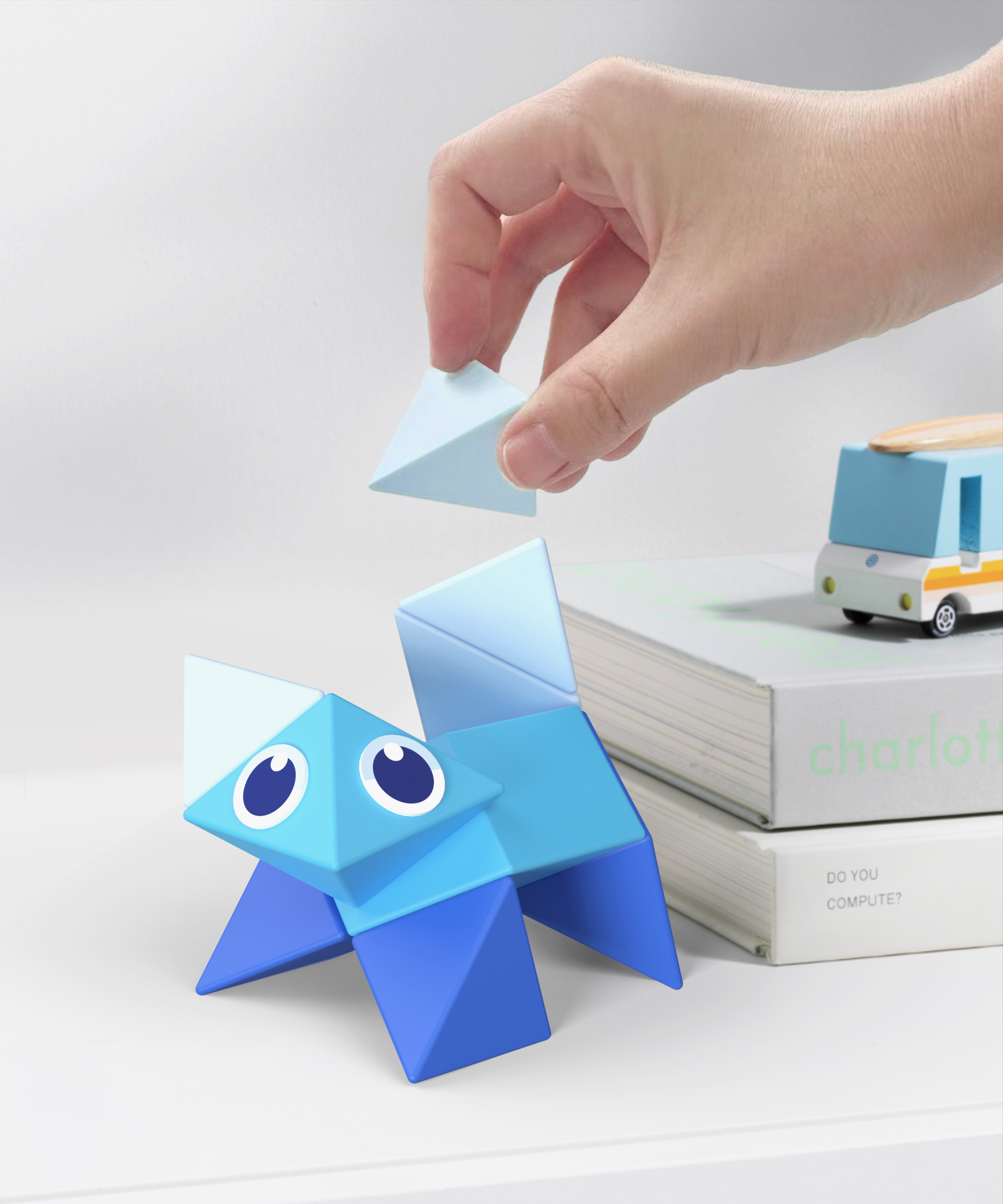 六种积木的体积成倍数关系,且它们的每个面都是由一个或两个相同的等腰三角形组成。每个等腰三角形包含正负两个强力磁极,保证任意面都可稳固吸引,使玩家可以创造出丰富有趣的空间作品。