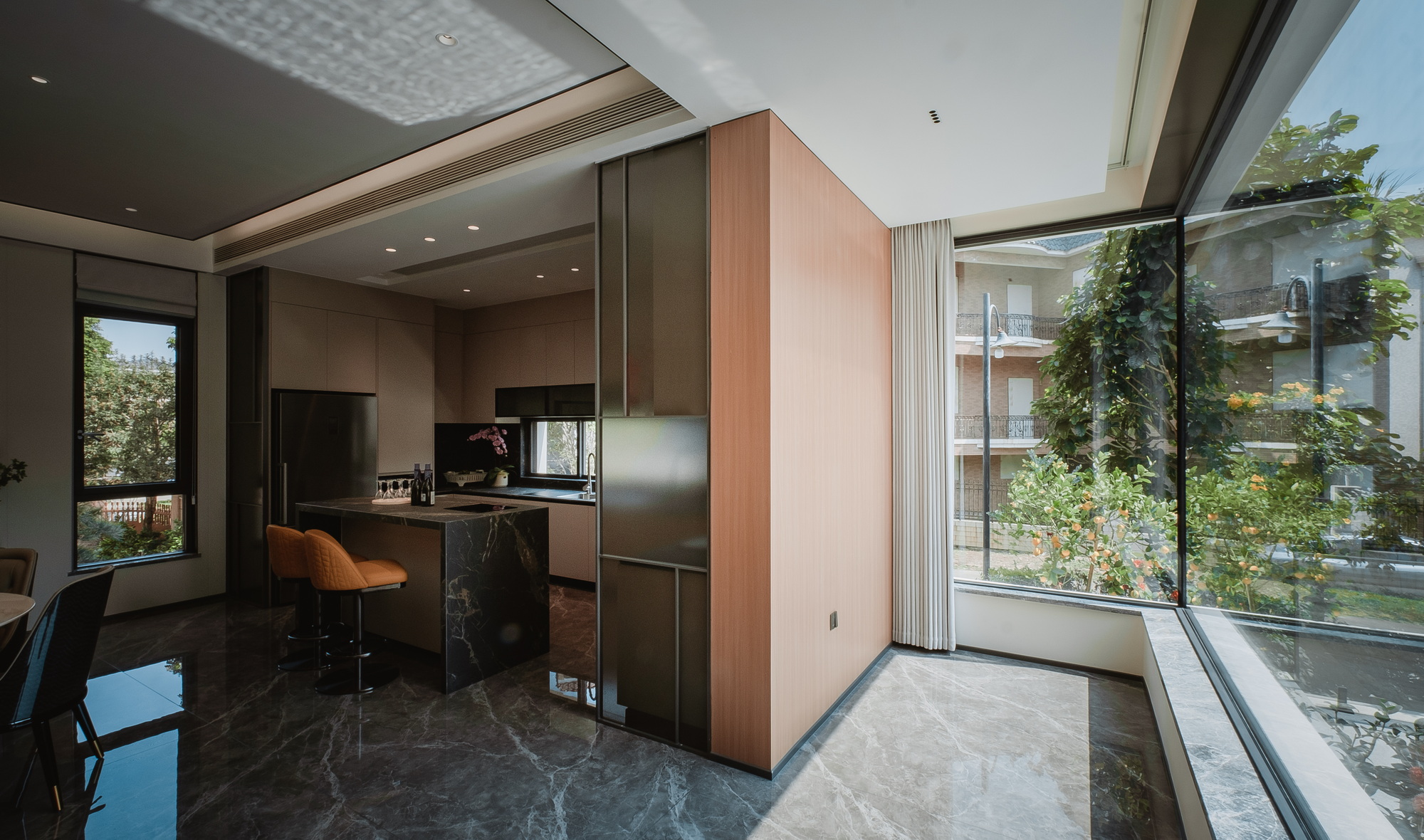原建筑是一栋20年普通欧式民宅,设计师为房子重新规划了居住的方式与空间的秩序,将当代诗意的生活方式注入空间。当房子重新以一种现代简约的风格呈现出来时,业主非常惊讶与喜欢。整个房子的布局呈内向L形平面规划,环抱着东南向的花园空间,室内空间也是面向东南面的花园一一打开,L形的两端是客厅公区与开放式的餐厨空间,L形的动线交接处是一个多功能的现代茶区。形体.光线.景观与内部空间相互咬合,充分地反映了设计师追求人与空间.自然和谐对话共生的诗意居住理念。设计师为业主构筑了一种全新的生活模式与现代居住空间 ,自由.当代.灵动,自然光影与诗意,空间与生活在此互相辉映,和谐共存。