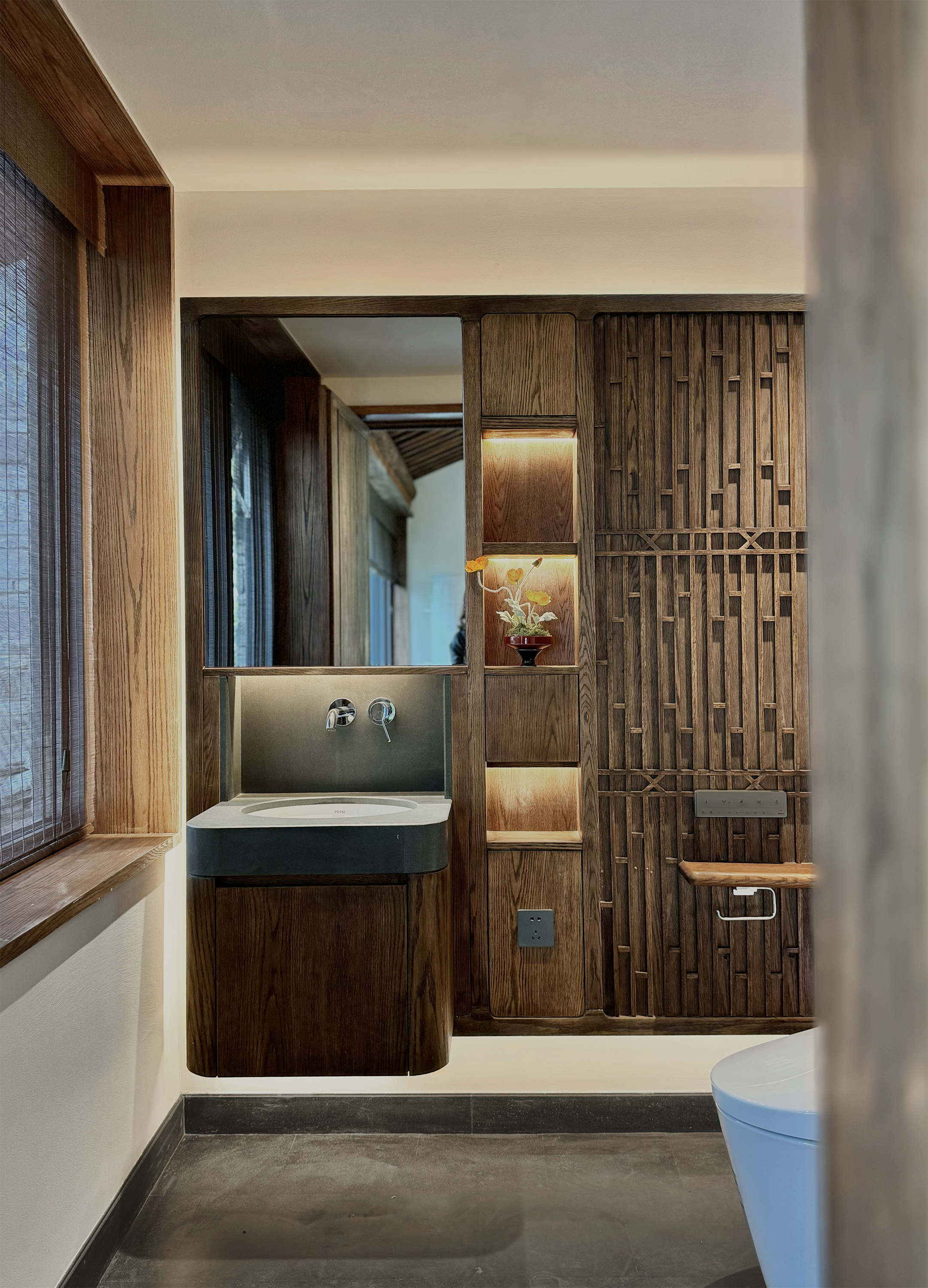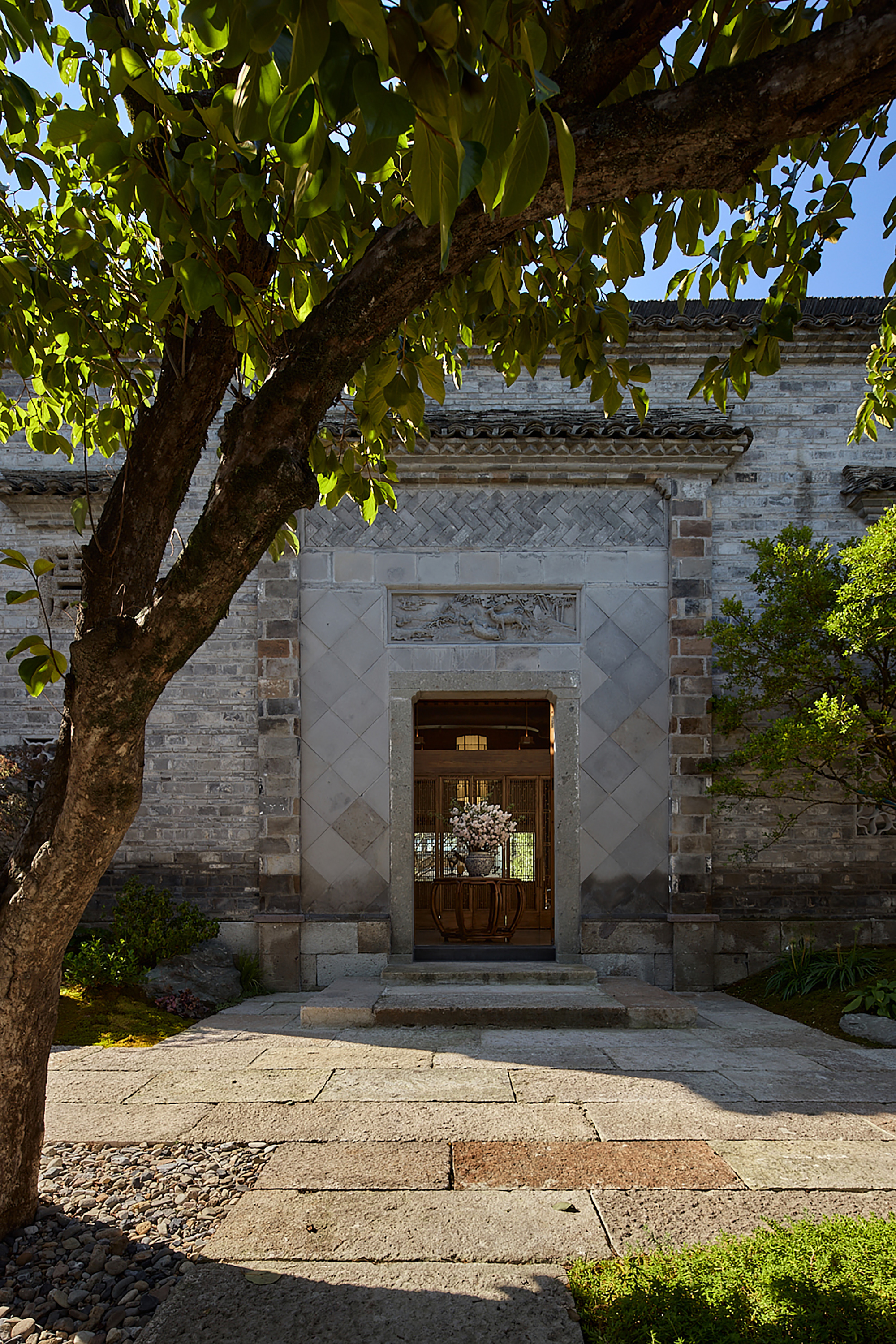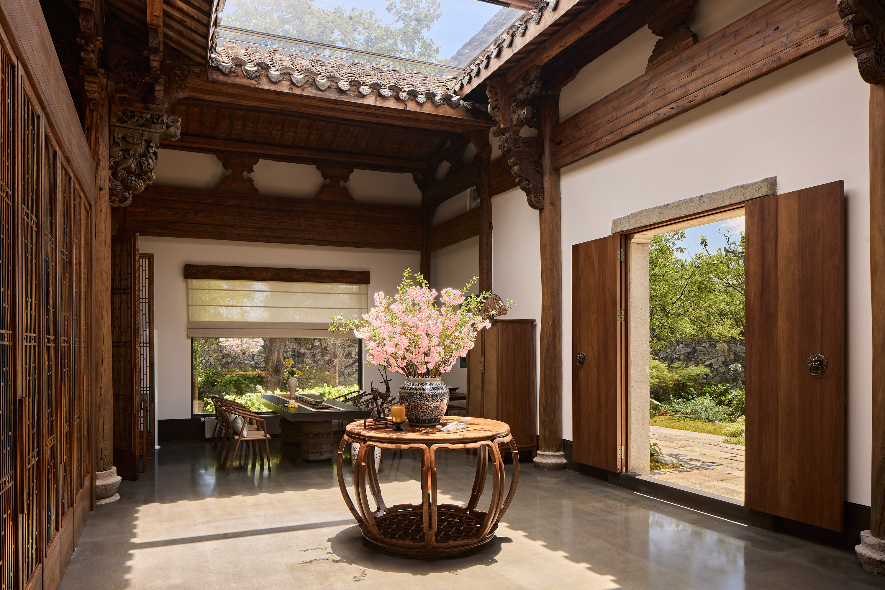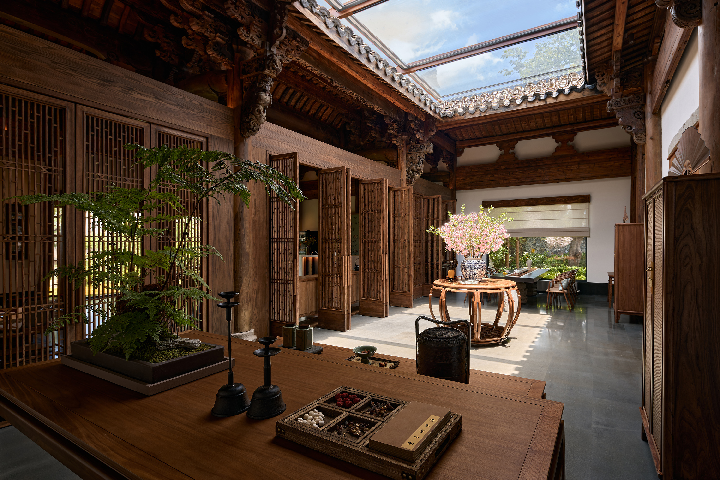云厨餐厅,坐落于杭州西溪湿地坞家湾景区内,将古建的韵味与现代中式餐饮完美融合。其一,古建修缮是本案重要设计工作之一,通过打磨、修补、上色,使木构架恢复昔日光彩,设计团队以 “修旧如旧” 的手法,对古建筑进行精心修缮,重现其历史风貌,同时新增木隔断与原建筑和谐共存,让光影在木色间交织出诗意篇章;其二,在空间布局上引入自然,将副楼二层改造为室内空间,南北两侧新起横长窗户,将临湖美景及院内景观引入室内,另将一层主厅临湖面及前厅西侧的原墙面打开,做成大面落地玻璃窗将湖光山色引入室内,让宾客在觥筹交错间尽享美景;其三,进行古建灯光营造,为了让最美的屋顶木构架及雕梁画栋能更好的展示,也为提升整体空间的亮度并最大程度的保护古建,设计采用抱梁悬吊式上下发光的海棠造型灯均匀布置在空间中,使得空间明亮温暖又凸显了古建的精华;其四,采用现代艺术中式陈设,家具以现代与中式混搭为主,艺术陈设以传统文化新演绎的方式为空间注入了新的艺术气质,使其成为现代餐饮与传统文化交融的经典案例。
