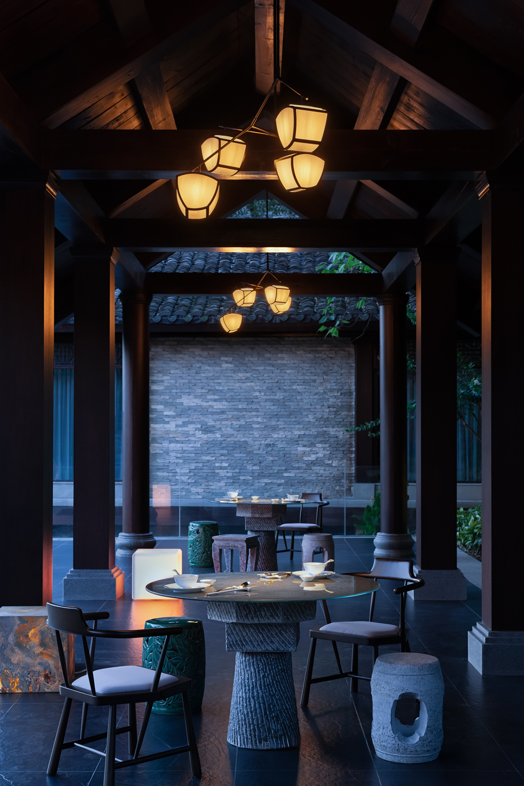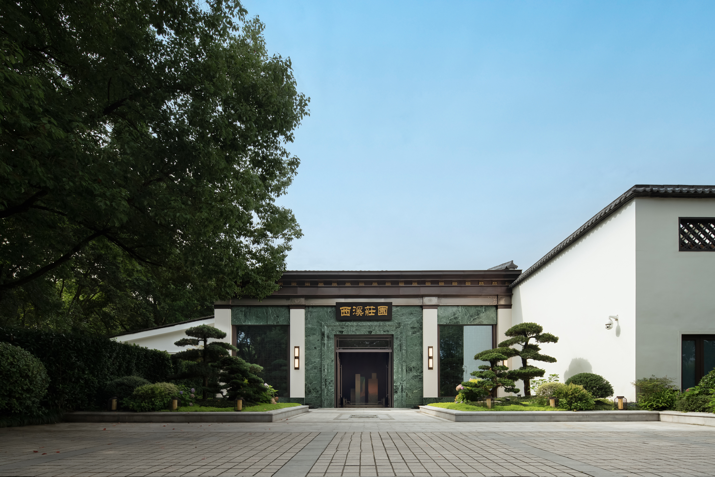 庄园坐落于杭州西溪湿地的静谧风光之中,设计上将传统与现代元素做了有序融合,亭阁廊桥掩映在绿水青山之间,给人一种与自然共生的深邃意境。庄园内部,材质表达及光线的运用均希望藏身于自然景观中,营造出静谧的氛围,器物及软装家具布置同样尊重传统与当代之间的平衡感。