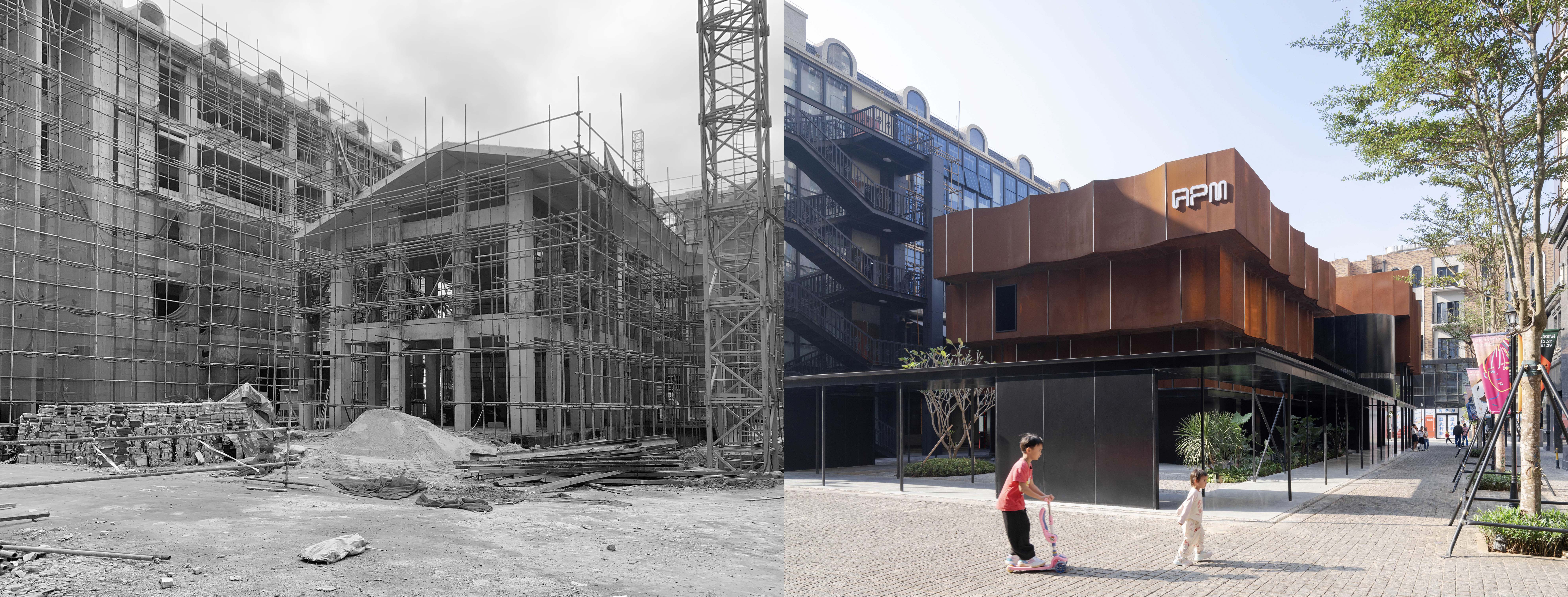 apm 是 noya 团队在海口高兴里策划的更新改造项目之一,原状为新建的二层坡屋顶建筑,后改为小型社区美术馆,为社区植入当代艺术,并带动街区东侧的活力。设计中,我们通过引入围廊、堆叠阵列体量等方式重塑了原建筑的形体与公共性。耐候钢板的使用使得建筑在时间的沉淀下日渐动人。室内设置了黑、白两个展厅,赋予小小的美术馆更多的可能性。