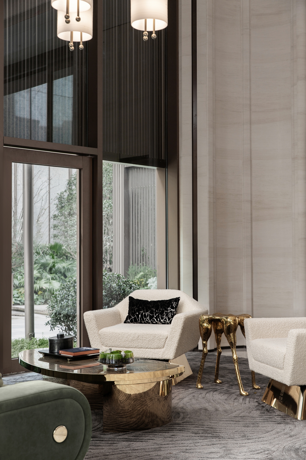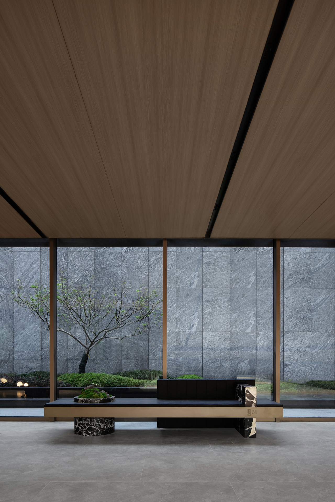 该项目为武汉天地云廷的公区与架空层设计,整体以“向云端”为主题,选用仿云朵层叠效果的灯具和带有云雾元素纹路的软装家具,打造置若云端的空间意象。艺术装置因地制宜地融入武汉风光、传统工艺及非遗,打造出具有武汉城市文化特色的软装艺术品,链接自然人文与建筑空间。材料上采用防污耐磨天然大理石,搭配不锈钢金属和皮料,使空间具有美观与实用的双重性。此外,动线设计上利用植物造景引导公区向架空层的自然过渡。