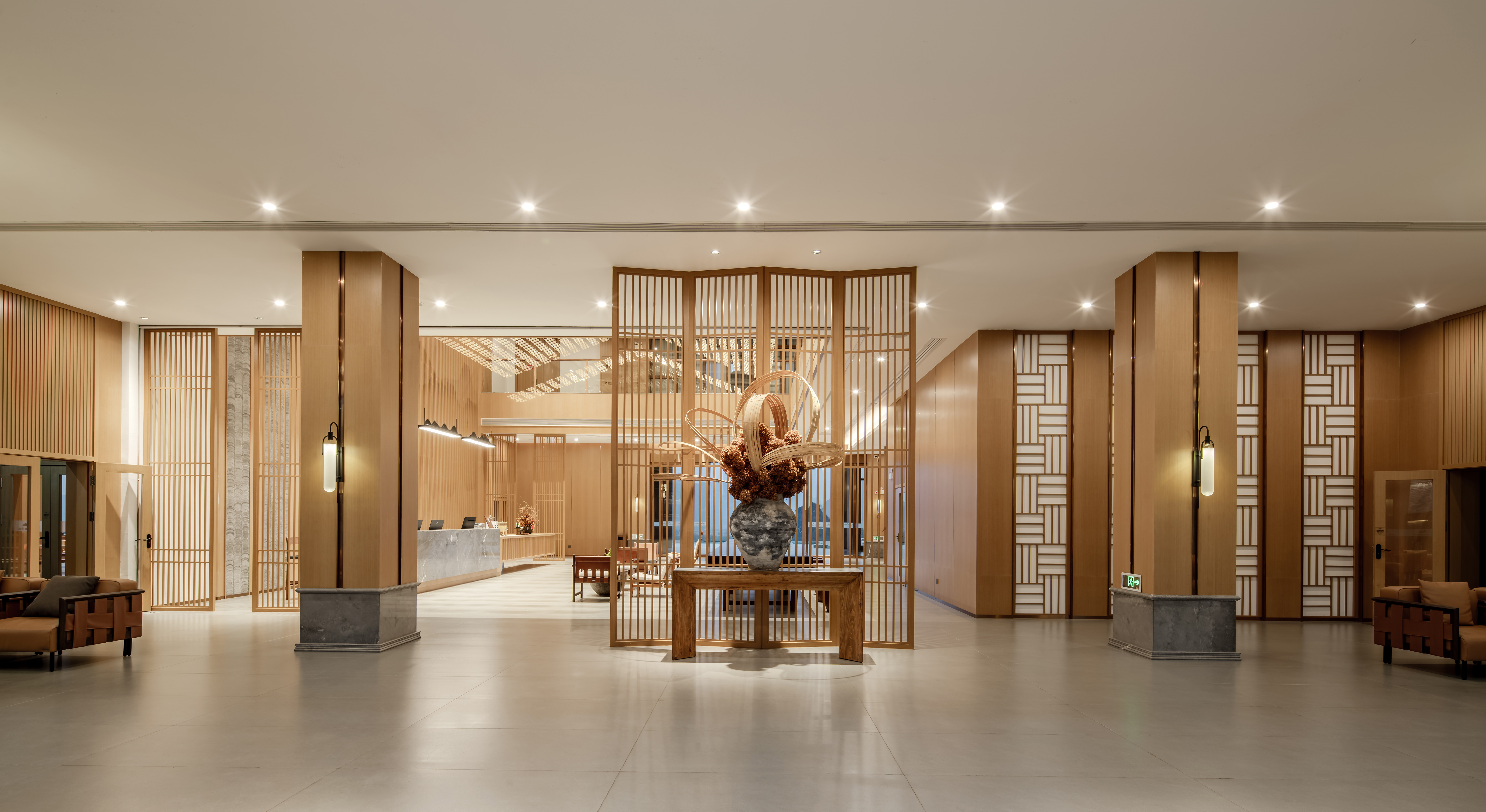 项目面朝黑水河、喀斯特群山。设置大堂吧、商务酒廊、阳光书吧、全日制餐厅等功能,打造自然交融又极具现代特色的度假酒店。室内设计注重自然材料与简约风格的结合,采用天然木材、石材等元素,定调现代复古主义设计基调。以简约平直的线条与纯白的墙面漆展露明晰清爽的空间底色,精巧的复古元素设计被隐匿于中古家具的边角。大堂由999片琉璃瓦组成的中式屋顶造型艺术灯别具匠心,穿过大堂室外的无边泳池与远处的喀斯特地貌交相辉映出一副壮美广西的山水画卷。大面积落地窗将室外自然山水引入室内,一丝一角都散发出不动声色的山隐诗意。