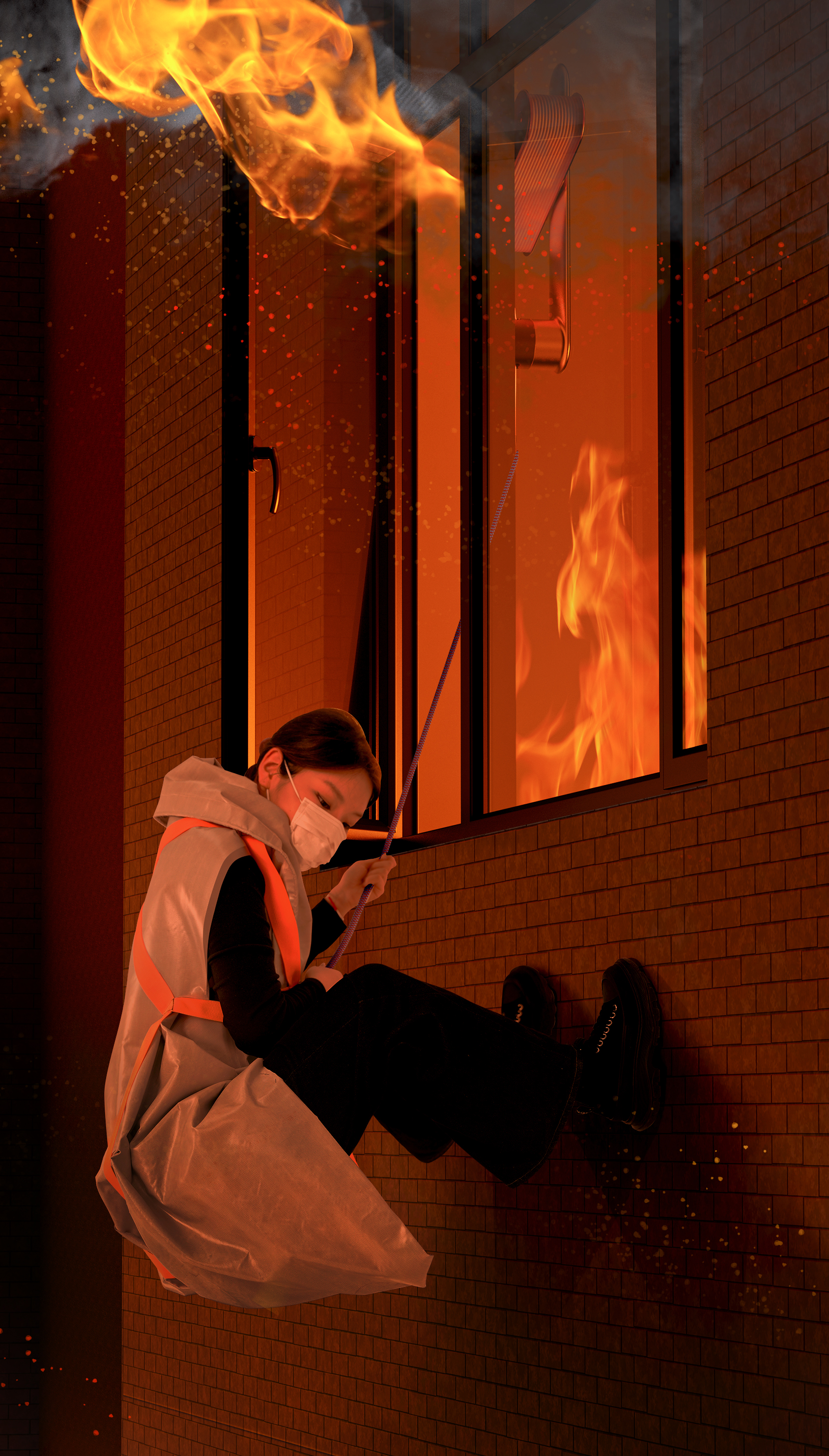 在城市火灾中,逃生路线可能会被阻断,因此从室外逃生是唯一的选择。无保护的高层建筑室外逃生的存活率不到 5%。为了解决这个问题,我们设计了结构和形状都有所改进的逃生绳索和缓降器,并结合窗帘,将逃生设备融入家庭环境中,使其易于使用。 「逃生窗帘」让更多的家庭在需要的时候有逃生设备可用。让他们在不得不跳窗时,能够快速、安全地逃生。