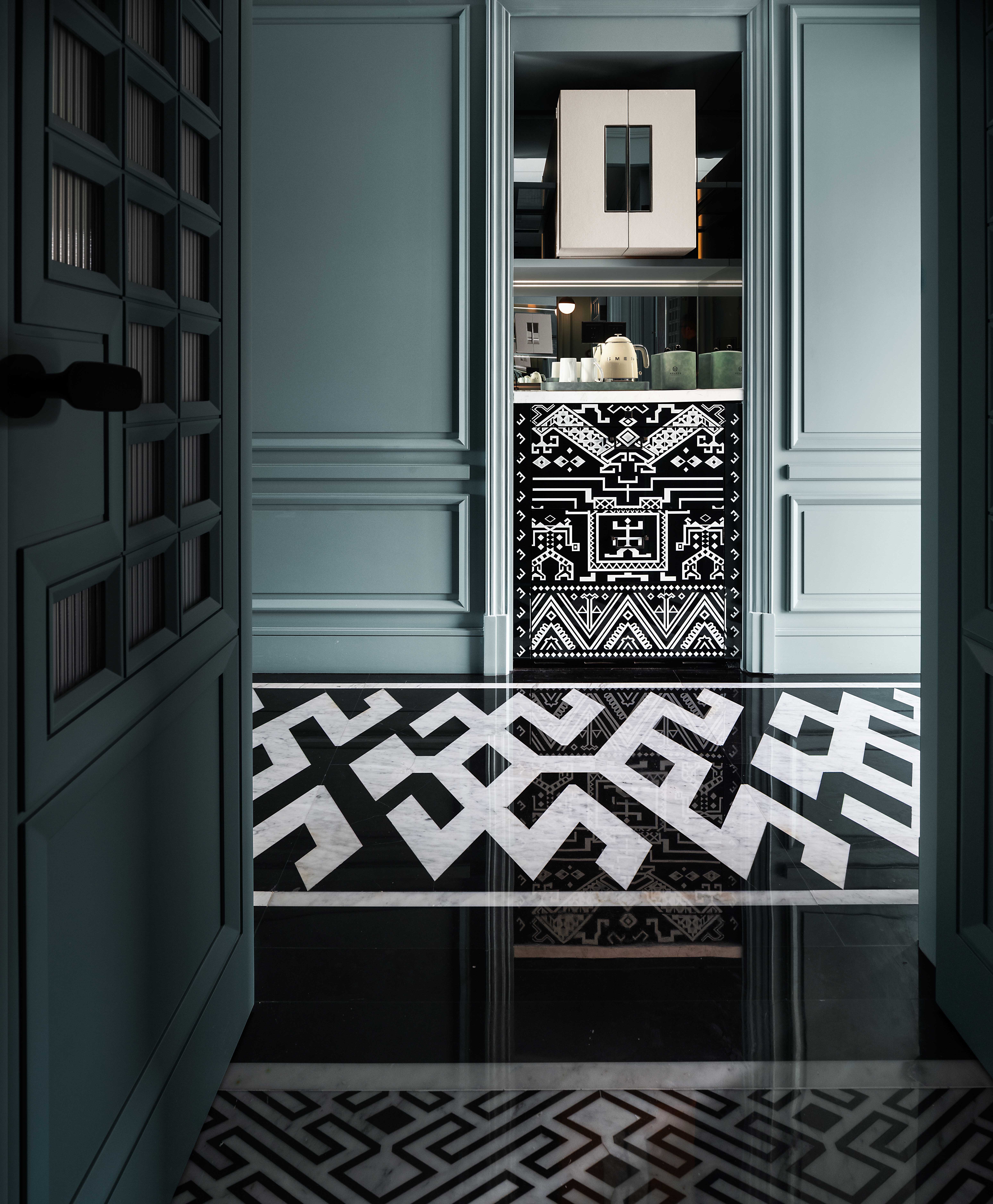 整体设计采用黑色、白色大理石和木饰面材质,在公区走廊、宴会厅及9层户外茶室墙面,采用3D精雕铝板来代替传统的木饰面,具有耐腐蚀、防火的特性。所有不锈钢的选用因其在地属性采用316不锈钢,具有更耐腐蚀的特性。